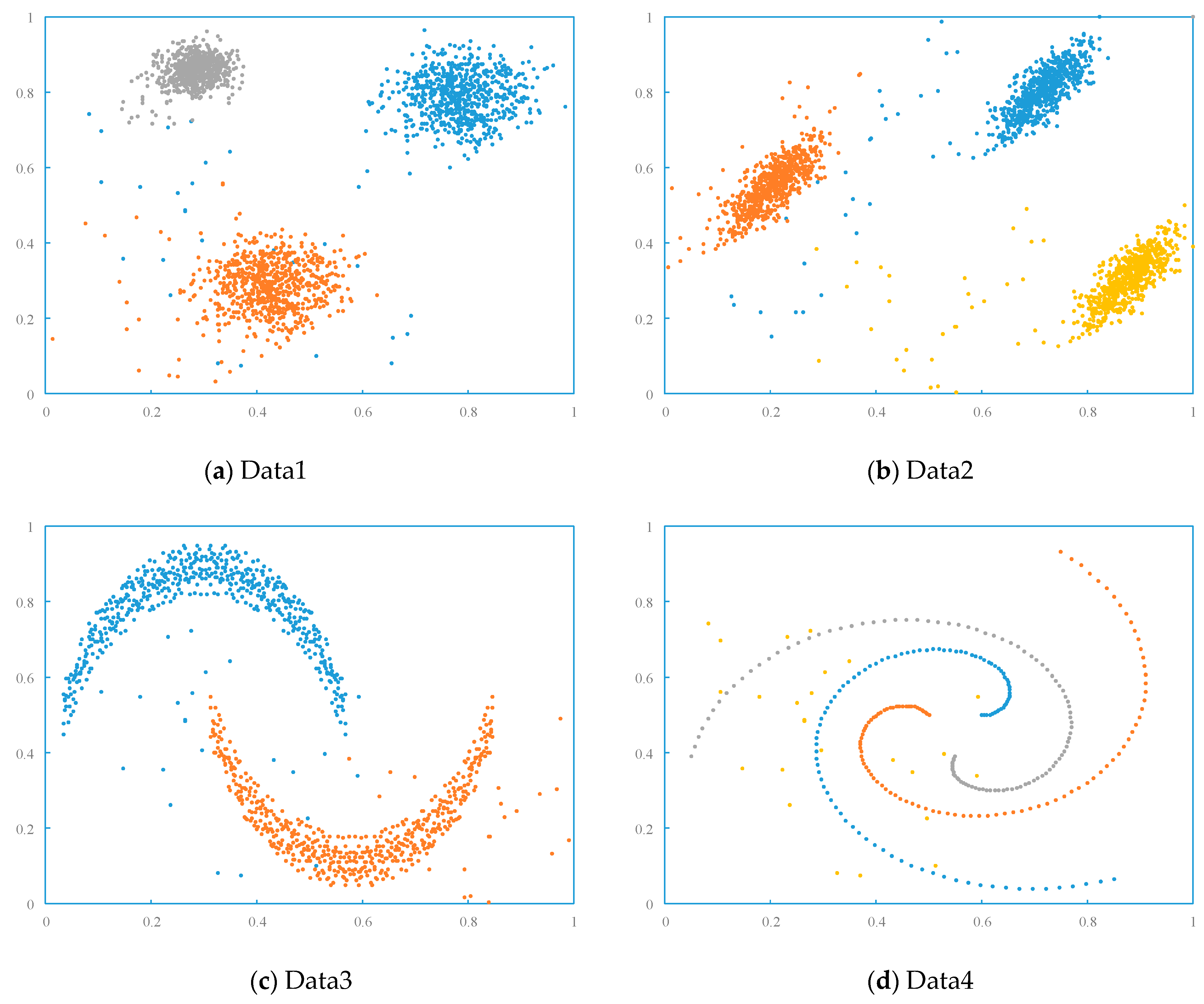 Figure 2 describes the distribution of the two-dimensional artificial datasets.