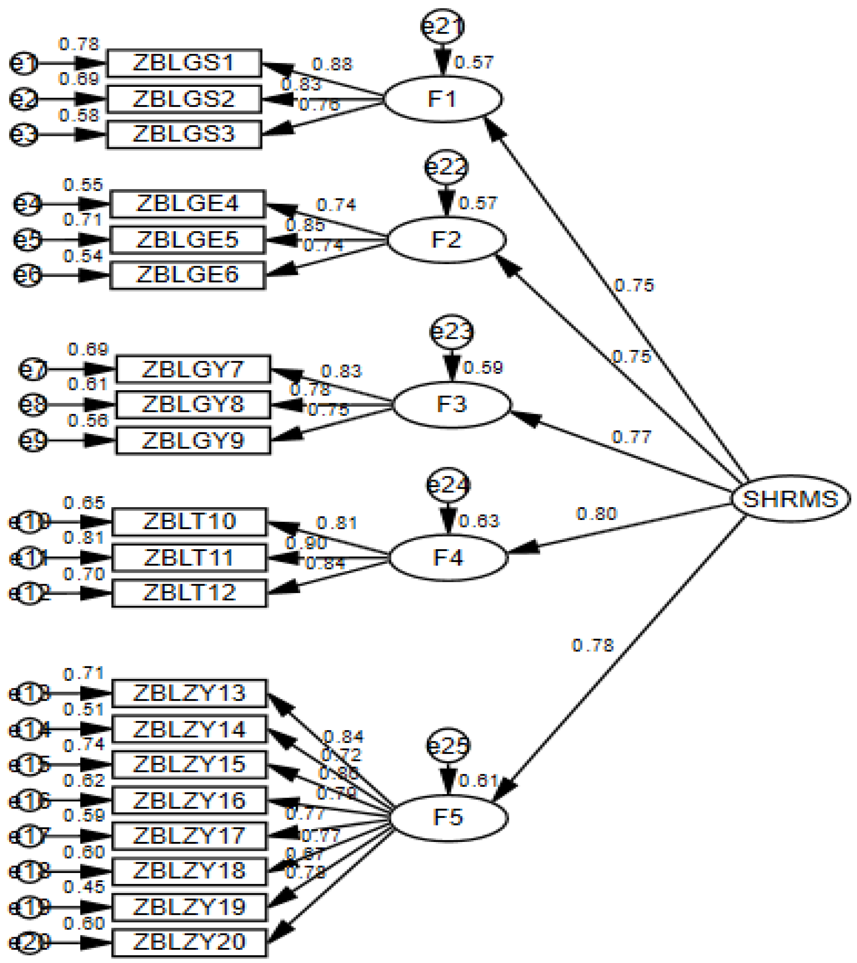 | Fit Index | Acceptable Range | First Order Measurements | Second-Order Measurements |