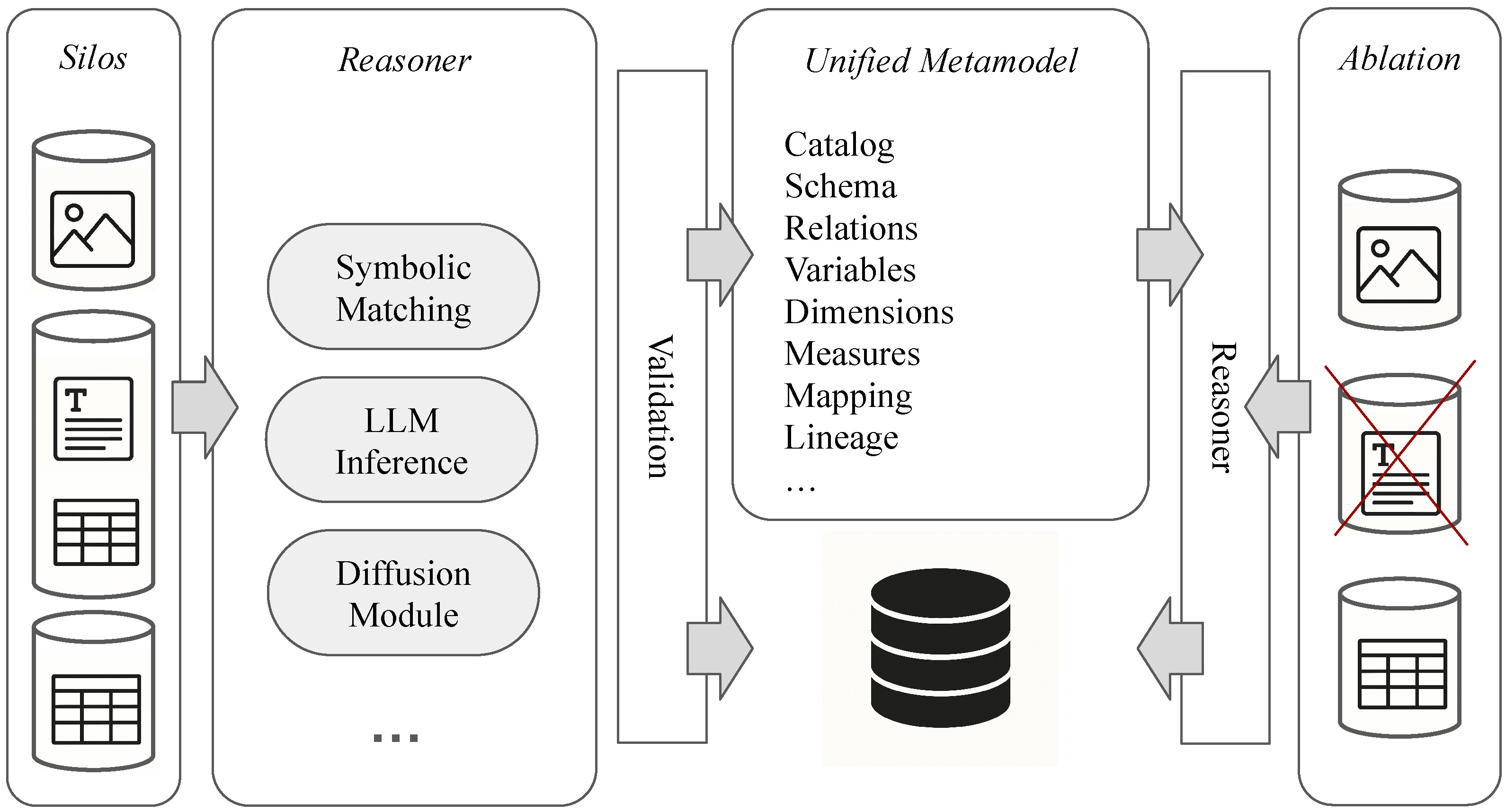 The proposed iterative process begins with the initialization of a unified metamodel upon the introduction of the first silo. At this stage, reasoning procedures infer the schema and establish normalization as a prerequisite to full integration. Once this foundation is prepared, the variables, entities, and relations of each newly introduced silo undergo an additional reasoning step to evaluate their alignment with the existing unified metamodel. The process identifies suitable candidates for mapping new elements; when alignment proves insufficient, the unified metamodel is extended to incorporate the necessary concepts. In cases involving the removal of a previously involved silo, the reasoning process assesses the implications of deleting or modifying the remaining structures. After each cycle, a revised version of the metamodel is generated and preserved, thereby documenting both its evolution and the progression of the unification process over time.