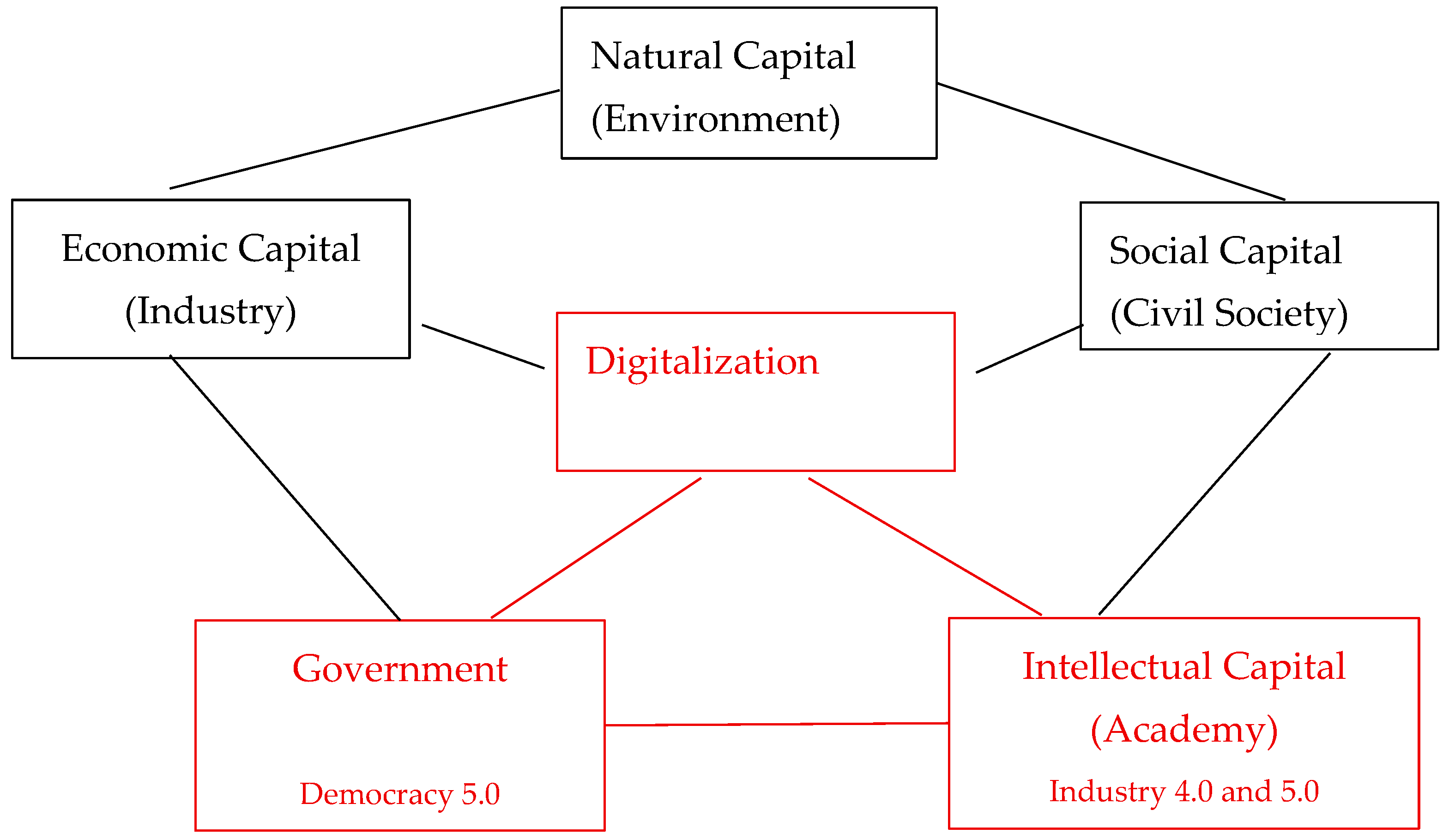 13] in the form of new types of transformation and digitalization. This model supports the creation of a mutually beneficial relationship among ecology, knowledge, and innovation—through transformation and digitalization—thus generating synergies among the economy, society, and democracy [