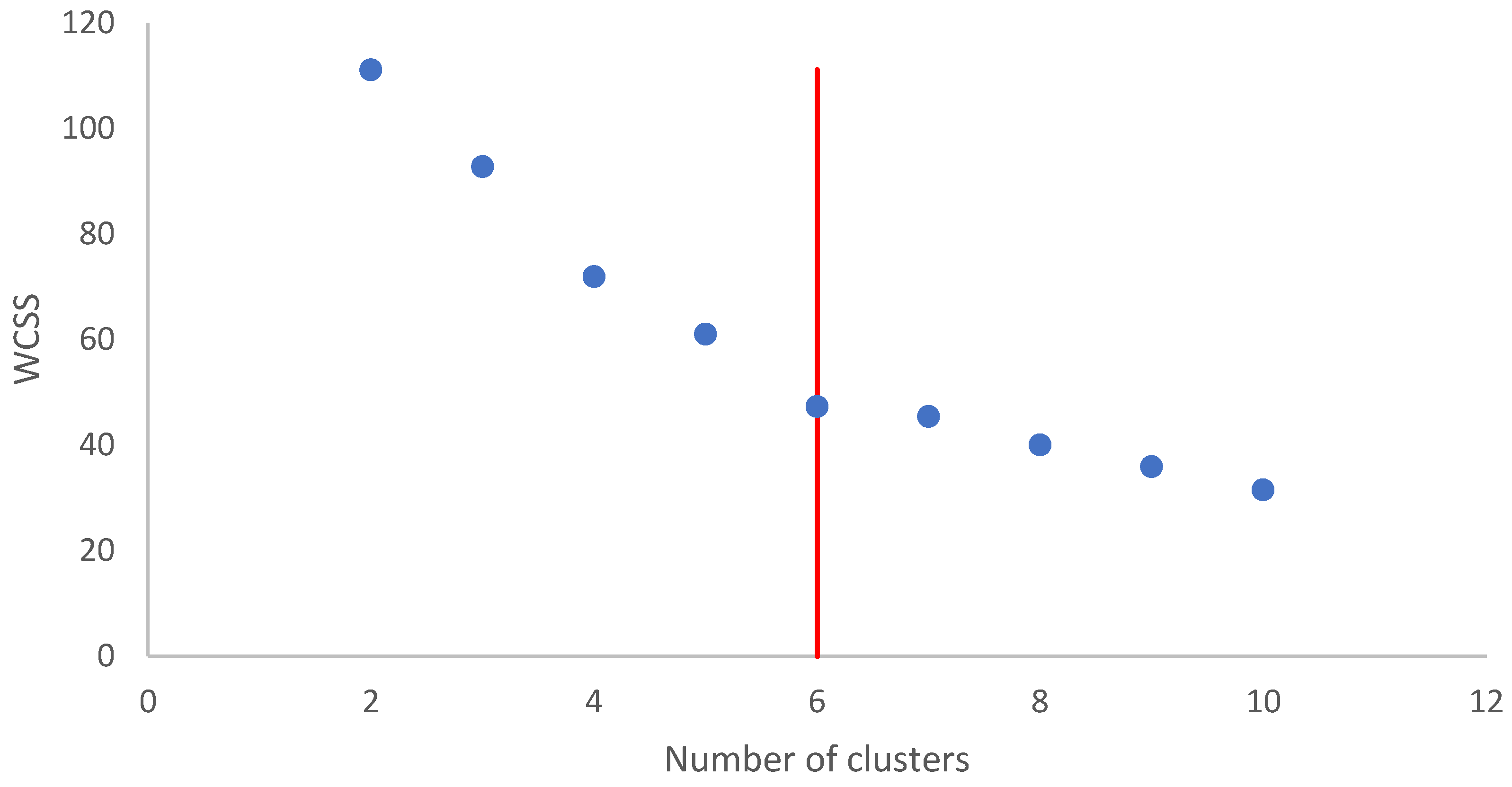 Figure 2) method, we identified the number of clusters to be 6 or 7 by visually estimating the largest reduction in benefit (elbow). However, this visual method can lead to over clustering [