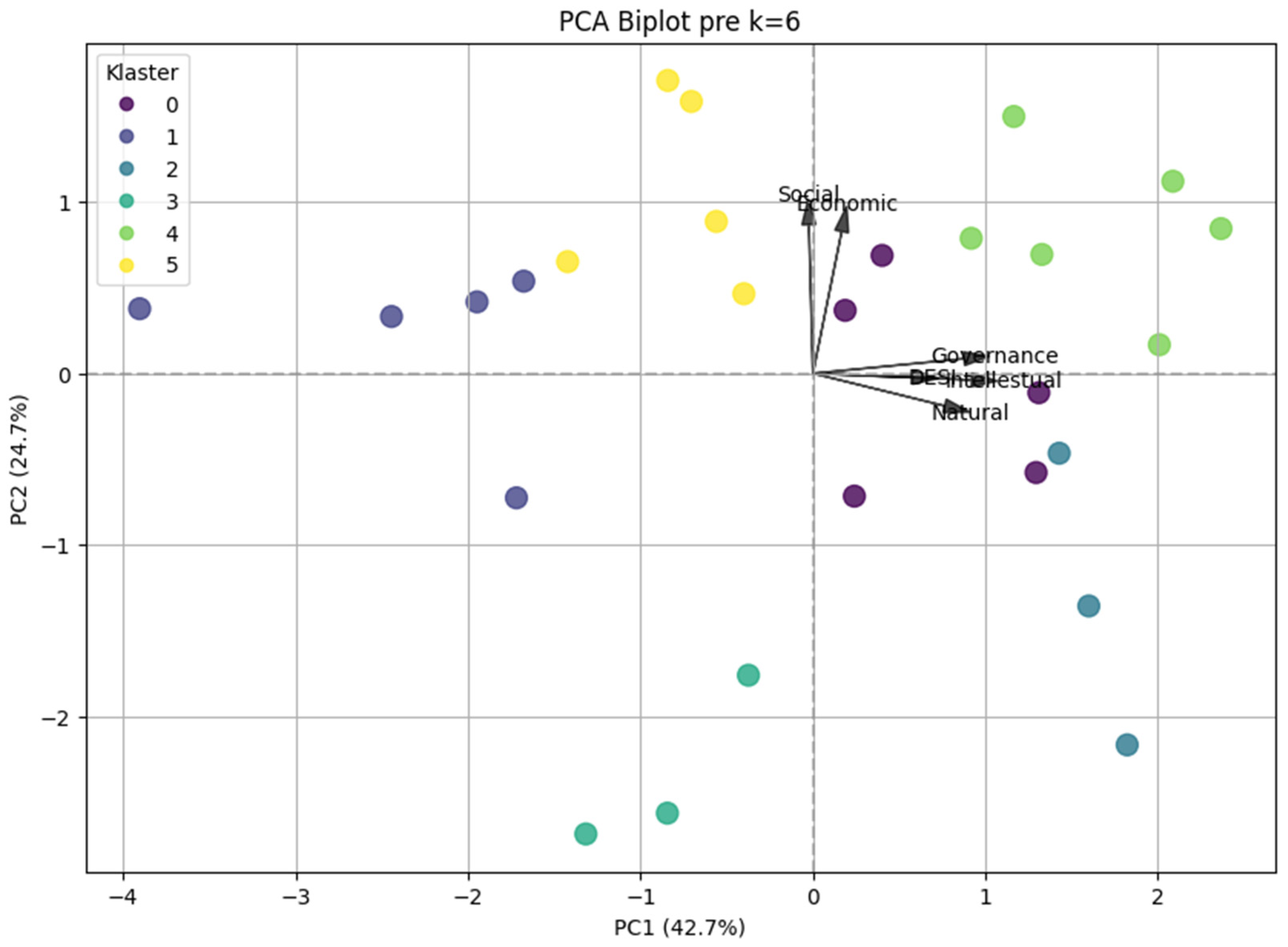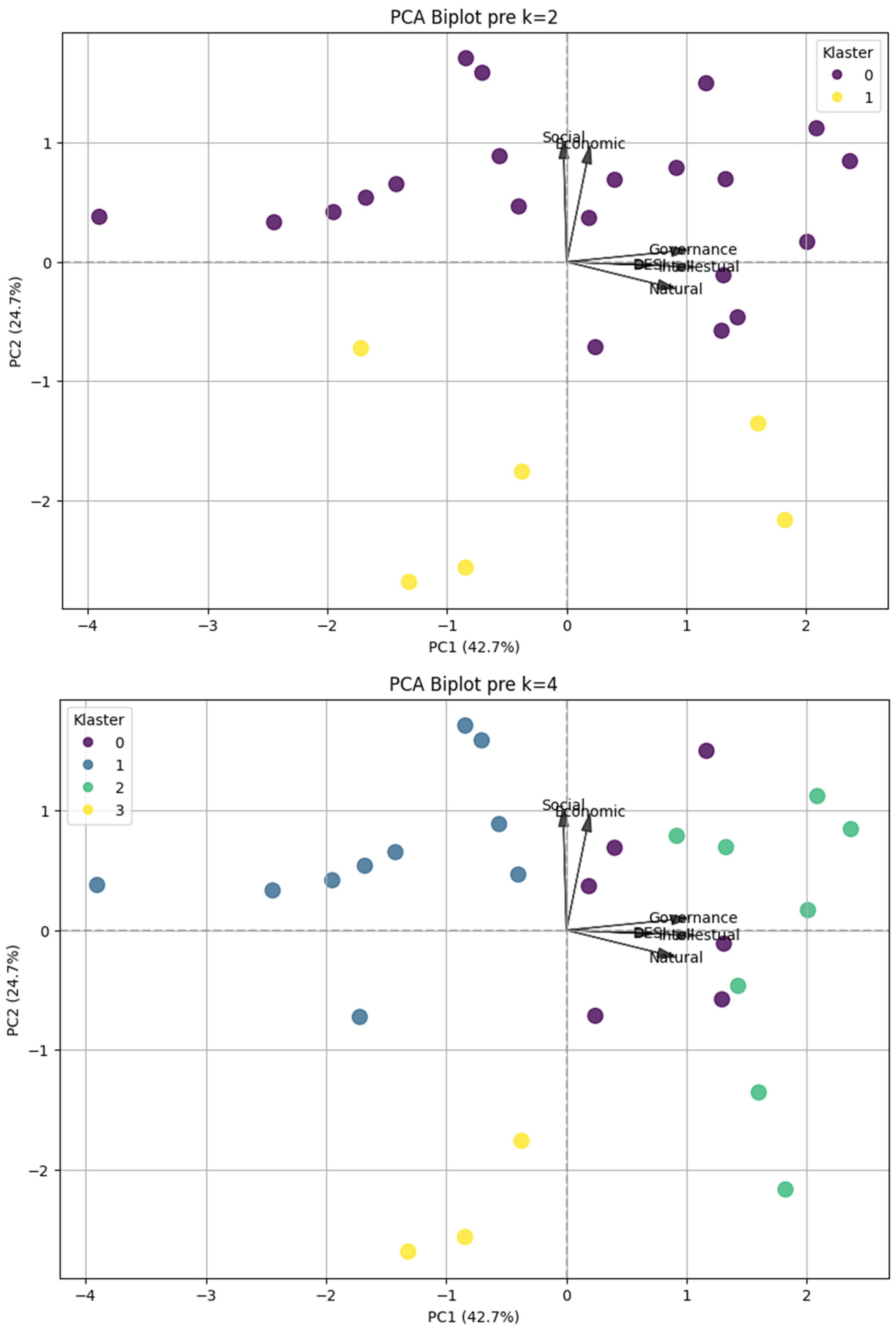 Subsequently, to identify homogeneous groups of EU countries that exhibit similar characteristics in terms of the structure of the Quintuple Helix model and digitalization, K-means cluster analysis was applied. It is one of the most widely used and fundamental clustering methods in statistics and data science. It partitions a dataset into a pre-specified number of homogeneous groups (clusters). The choice of the optimal number of clusters for K-means cluster analysis was based on the synthesis of several methods, with the aim of finding a model that is both robust and interpretably rich. The primary method used was the Elbow Method (WCSS) based on the method of squares and the visual estimation of WCSS. Another method was Silhouette analysis using the silhouette coefficient. To verify the stability of the structure, a consistency analysis was performed between K-Means and GMM using the Adjusted Rand Index (ARI) and hierarchical clustering (Ward’s method). Subsequently, the PCA Biplot method was used to validate the obtained results for visual verification of the spatial stability of the clusters. The resulting determination of the number of clusters is based on the synthesis of the results and the determination of the optimal number of clusters for performing the K-means cluster analysis. The primary aim of the K-means method is to identify clusters within the data that are internally similar but differ significantly from those in other clusters [