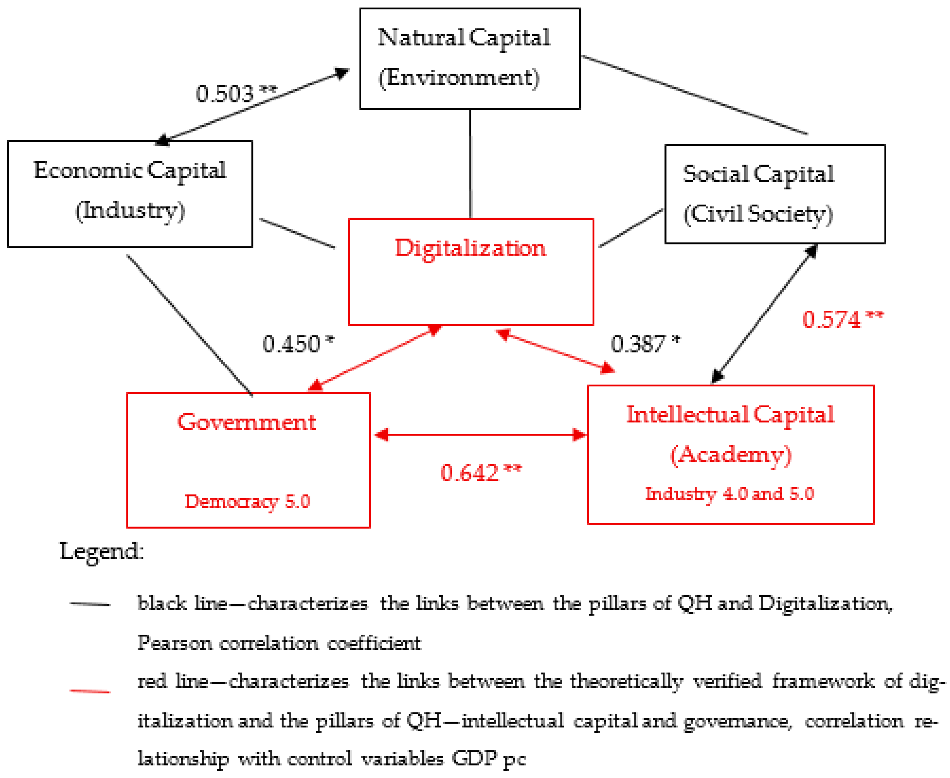 16]. Based on the results of this study, it can be concluded that this fifth helix of the Quintuple Helix model does not exhibit a statistically significant relationship with Digitalization, Governance, or Intellectual Capital. It demonstrates a statistically significant association only with Economic Capital (r = 0.503, with control variable GDP per capita). This finding supports the theory that environmental challenges are regarded as potential drivers of innovation [
