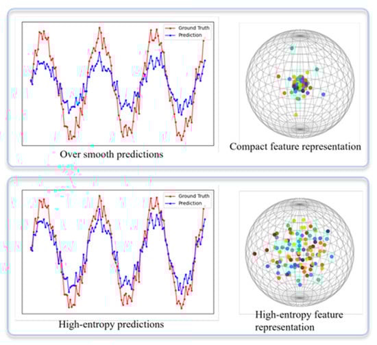 In traffic flow forecasting tasks, traditional methods commonly adopt the Mean Squared Error (MSE) or Mean Absolute Error (MAE) as optimization objectives. However, such regression losses inherently encourage models to produce “averaged” predictions to minimize overall error, leading to pronounced over-smoothing at peaks and abrupt changes []. Consequently, the predicted sequences fail to capture fine-grained temporal dynamics and overlook the true peaks and troughs in traffic flow, thereby degrading forecasting accuracy, as illustrated in Figure 1. Over-smoothing not only weakens the model’s ability to detect sharp fluctuations in traffic flow, but also limits the practical applicability of forecasting results in real-world traffic management scenarios.