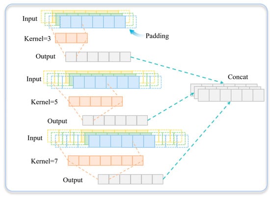 Building on this, to further enhance the model’s ability to extract features at different temporal scales, a Multi-Scale Convolution module is introduced, as illustrated in Figure 4. This module applies one-dimensional convolutions with kernel sizes of 3, 5, and 7 to extract features at multiple receptive fields:
