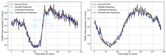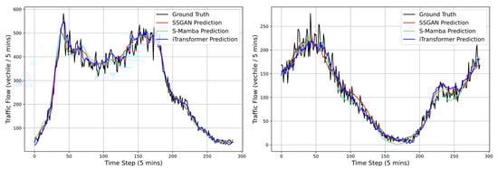 To provide a more intuitive illustration of the model’s predictive performance, we plotted the forecasted traffic flows of the three best-performing models, as shown in Figure 5 and Figure 6. It can be observed that all methods generally followed the overall trend of the ground truth; however, significant differences existed in fitting accuracy at traffic peaks and troughs. Compared with iTransformer and S-Mamba, the proposed SSGAN more closely tracked the true curve during abrupt traffic fluctuations, exhibiting smaller prediction delays and deviations. Moreover, SSGAN maintained high prediction accuracy in stable periods, demonstrating superior stability and robustness.