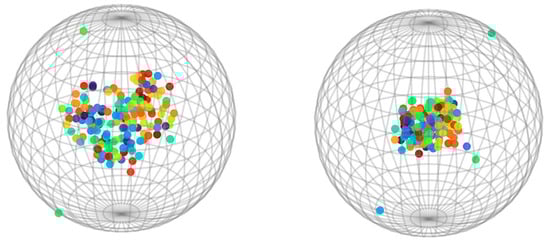 To evaluate whether the proposed SSGAN model can alleviate the over-smoothing problem in long-term traffic flow prediction, we visualized the 96-step predictions on the PEMS03 and PEMS08 datasets. Specifically, each prediction matrix was treated as a feature representation of traffic nodes. We first reduced the high-dimensional representations to three dimensions using t-distributed stochastic neighbor embedding and then projected them onto a unit sphere to preserve the overall distribution structure.