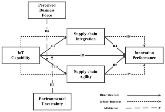 Although many companies can manufacture goods and provide services in a standard way, those with better SCA are more likely to realize the significance of innovative solutions and establish management systems that promote both innovation and efficiency, and the result is improved innovation performance [97]. In a market that includes a lot of competition, agility allows the supply chain to adjust to fluctuating customer requirements and various product preferences, rapidly meet customer orders, launch new products consistently and efficiently, and establish strategic partnerships with their collaborators in a short time [98]. SCA serves as a critical mediator that helps translate resource optimization into innovative capabilities, leading to better innovation performance [99]. Strong cooperation with supply chain participants leads to the generation of creative solutions that are essential for obtaining SCA. Then it is used to handle market fluctuations and manage unexpected environmental disruptions [100]. From the dynamic capability perspective, IoT technology significantly contributes to the supply chain, contributing to enhanced supply chain agility [42]. By enhancing agility, businesses can pursue innovative products and services in a more efficient way. Thus, dynamic capabilities frameworks emphasize the reconfiguration and adaptation of resources in dynamic environments [96]. This study proposes the following hypothesis: