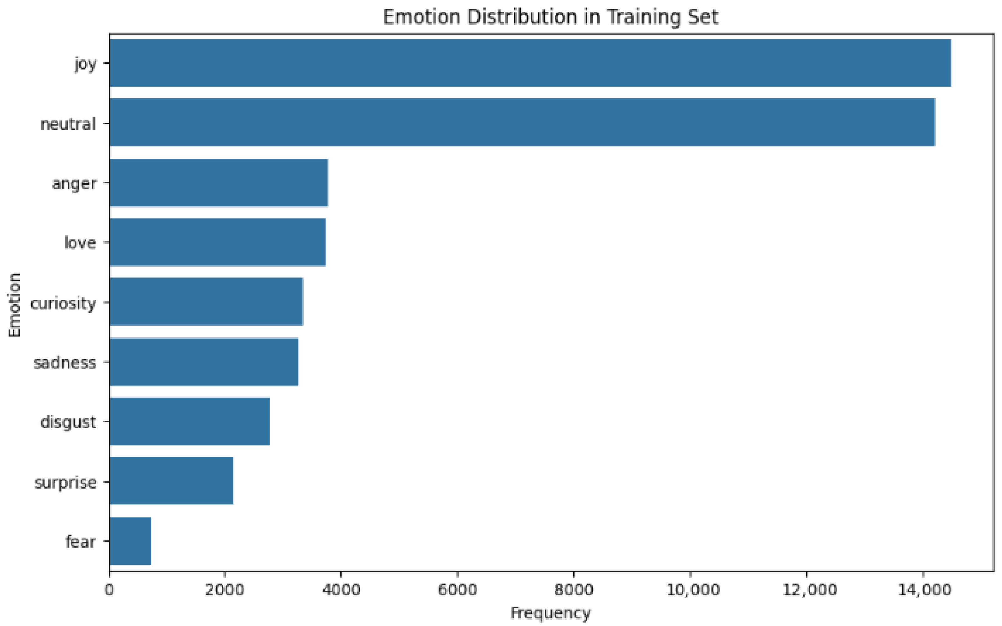 For example, positively charged labels such as admiration, amusement, approval, excitement, gratitude, optimism, pride, and relief were grouped under joy. Similarly, annoyance and anger were combined under anger, and caring and desire under love. Additionally, confusion and curiosity were grouped under the curiosity label to consolidate states of wonder/perplexity. Likewise, the sadness category includes emotions like disappointment, embarrassment, grief, and remorse. Disapproval and disgust were converted into the disgust category, consolidating more negative, repulsive emotions under a single label. Realization was placed under surprise, which best reflects an unexpected insight or understanding. Finally, the neutral category maintains emotional neutrality. This emotion mapping process facilitates the model’s ability to cope with complex and diverse emotions while bringing the analysis to a more understandable and manageable dimension. The mapping process was automated with functions utilized in this study; the original labels field of the GoEmotions dataset was adapted to the new_emotions set via the map_labels function. Thus, each text sample is represented by a multi-label vector consisting of the newly defined 9 basic emotions. This approach, while reducing the complex emotional texture to a simpler representation, contributes to mitigating data imbalance issues and enabling more stable learning during the model’s training process.