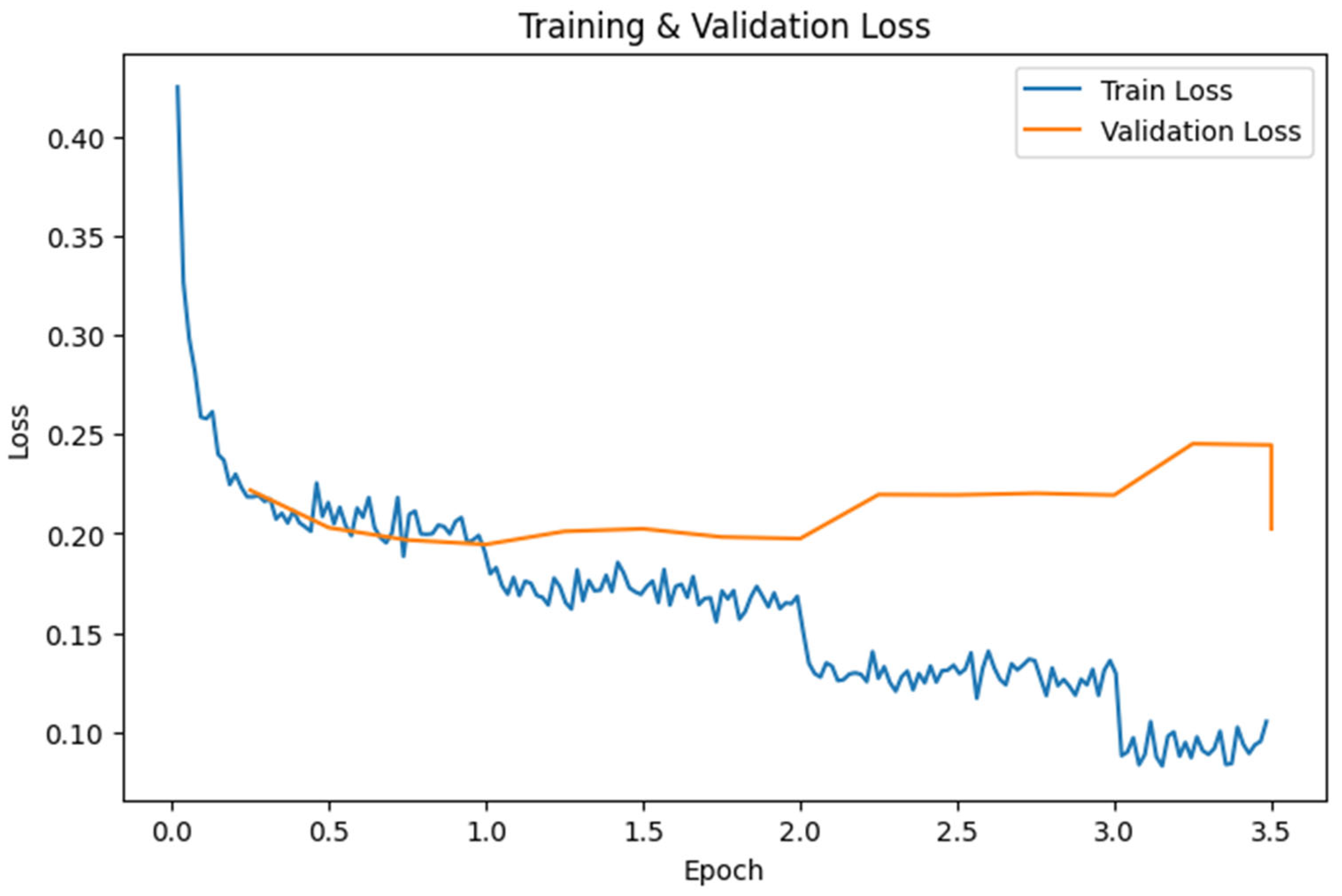 Figure 4, the training loss rapidly decreases from the first epoch and continues to decrease more slowly thereafter. The validation loss, initially higher than the training loss, shows fluctuations after the second epoch, but the model appears to progress towards the lowest validation loss around the 3rd to 3.5th epoch. The trend of the learning curves indicates that the model is still learning, but an overfitting tendency begins after the 2nd epoch. The early stopping mechanism intervened at 3.5th, terminating the training at the epoch with the best validation loss and F1-score.
