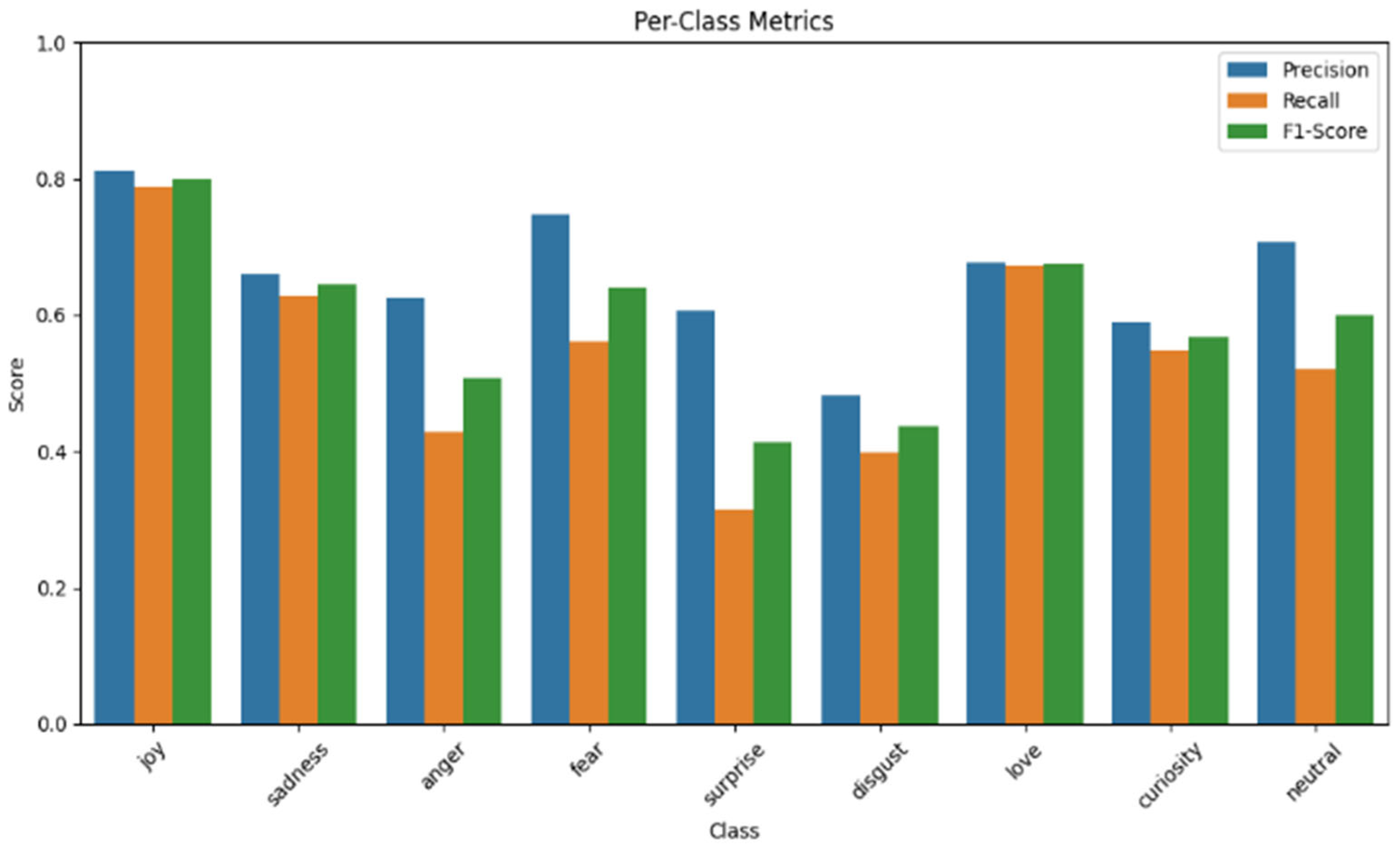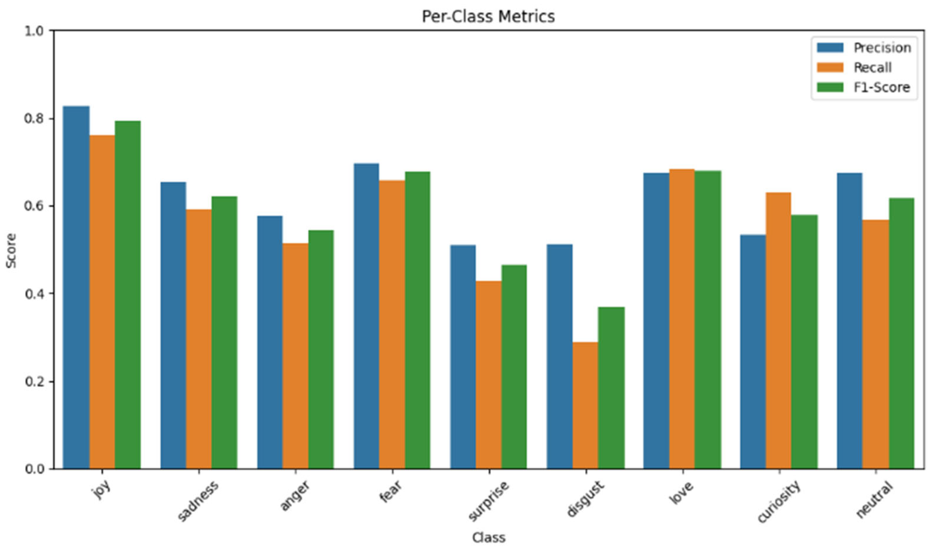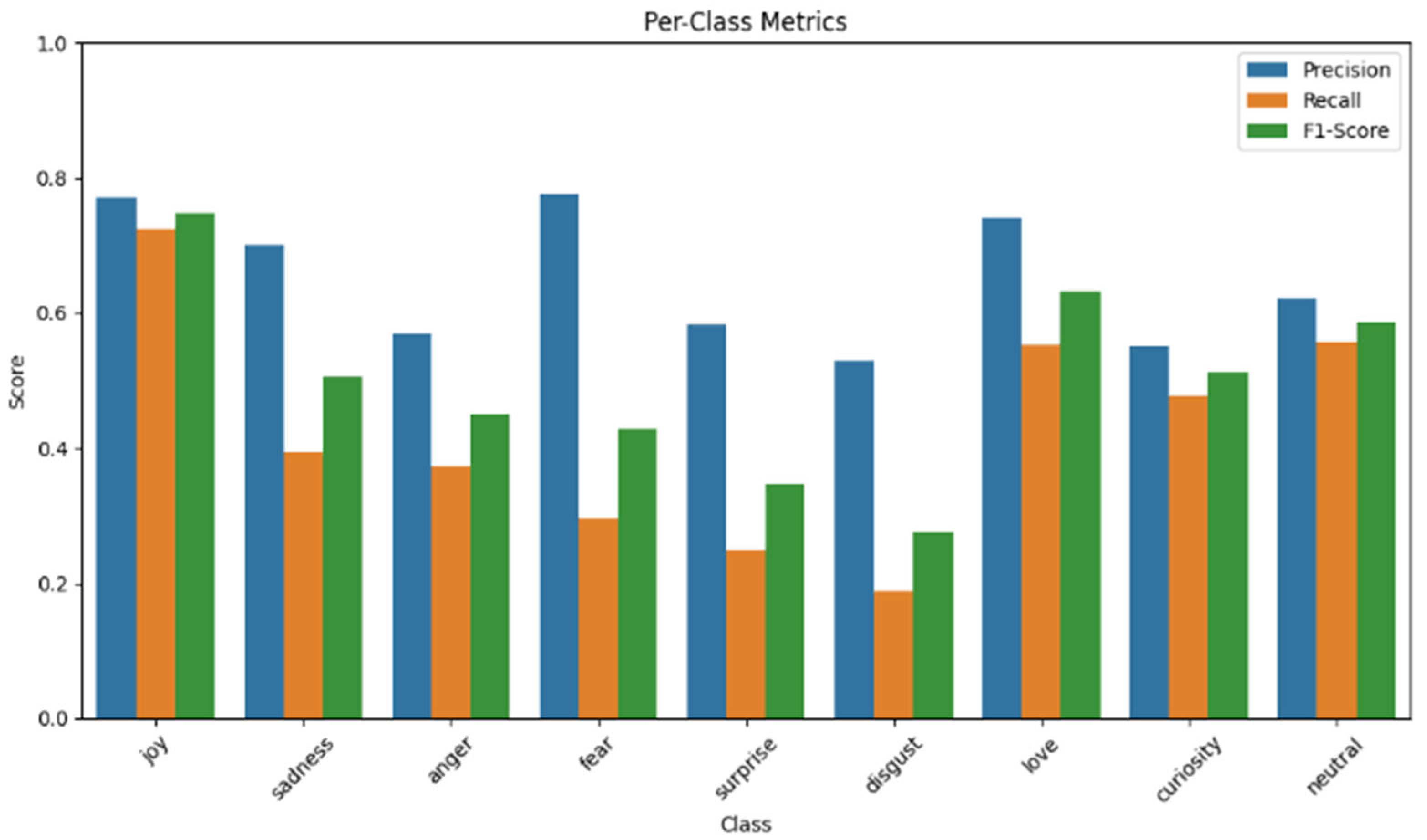40]. The performance of these models was evaluated through standard classification metrics, including accuracy, precision, recall, and F1-score. In multi-label emotion classification tasks, micro- and macro-averaged F1-scores are particularly informative, as they provide a balanced view of model performance across emotions with varying frequencies [