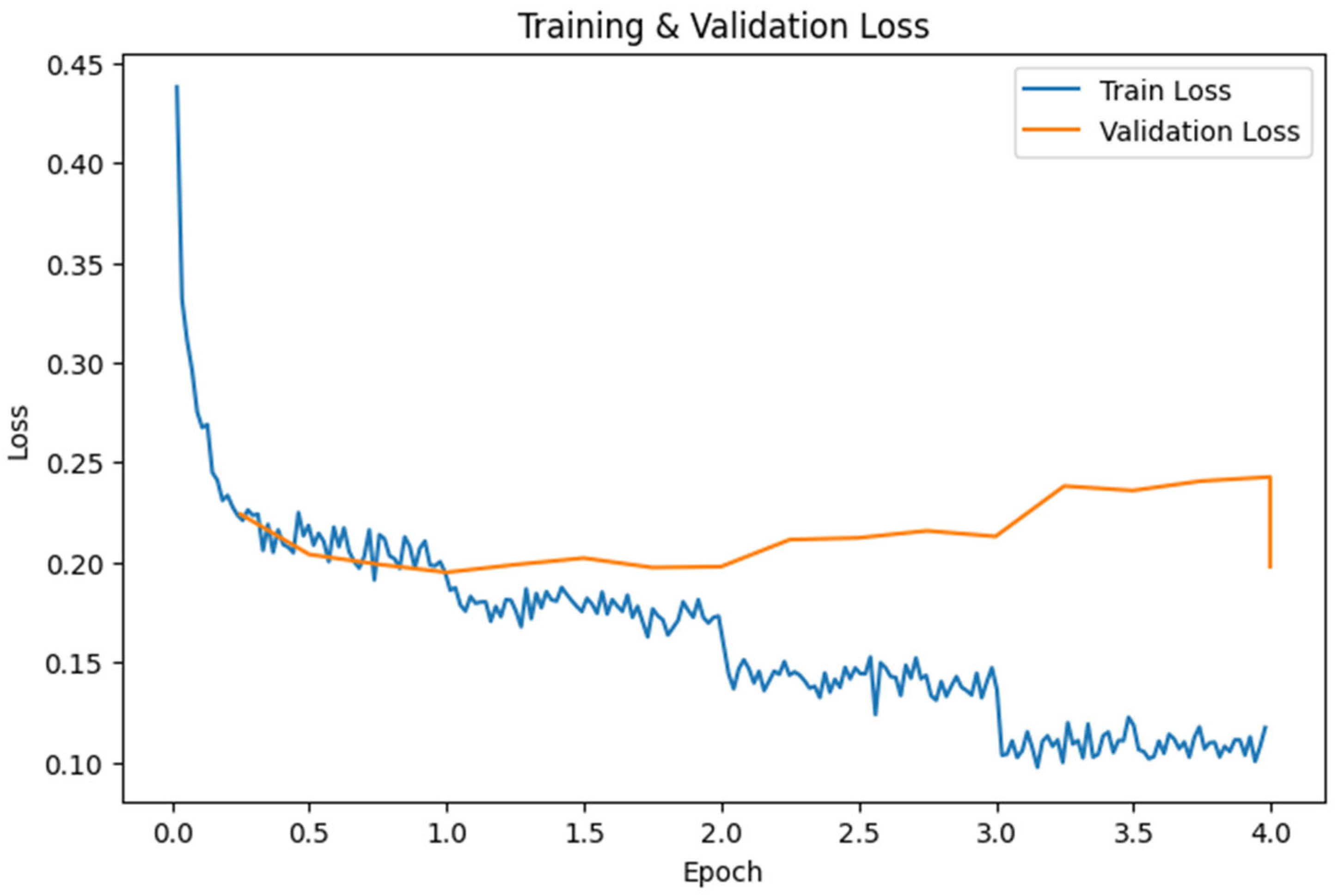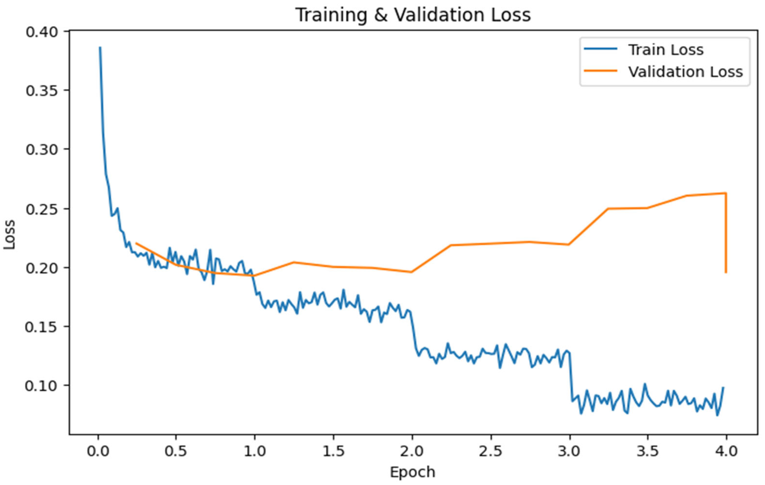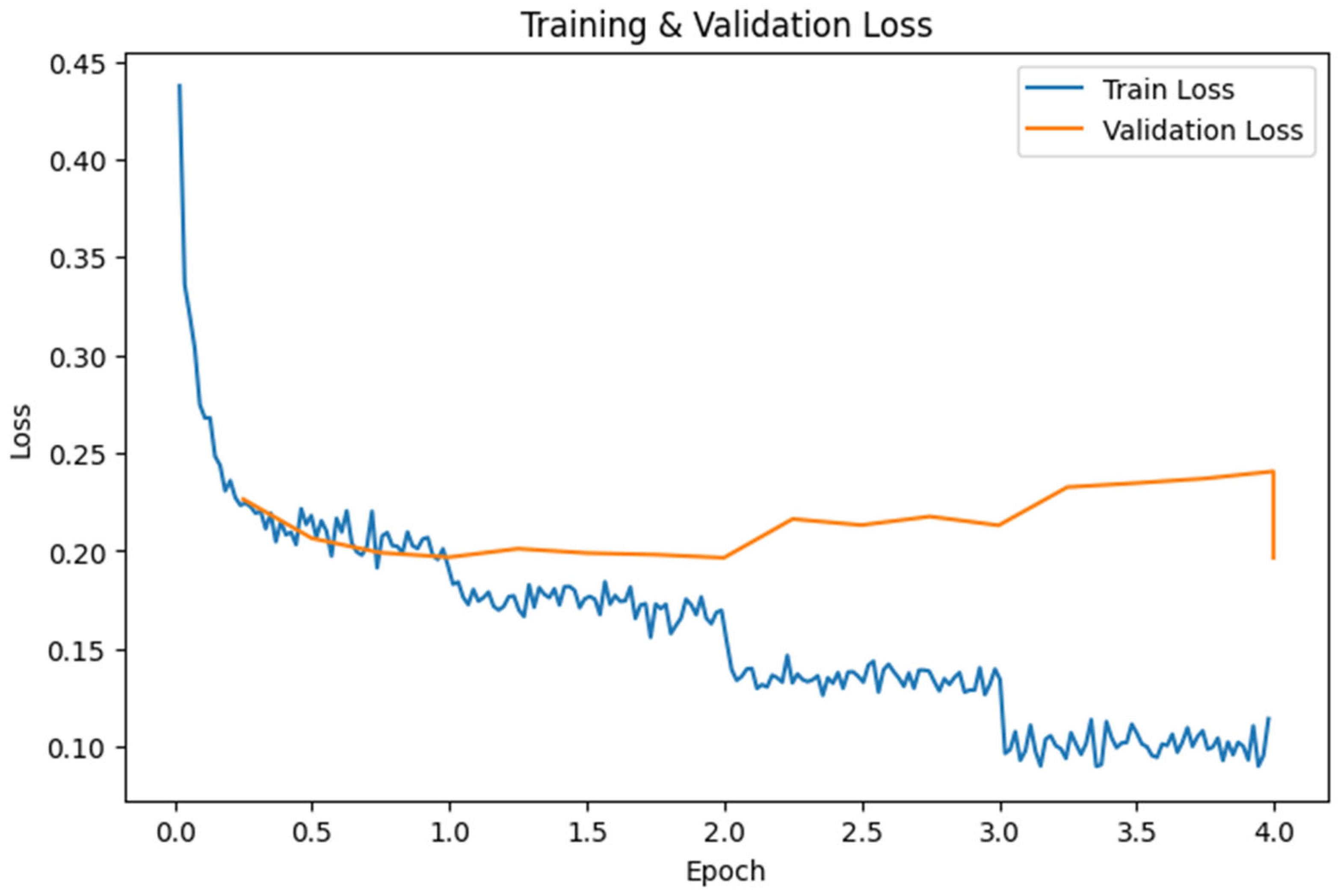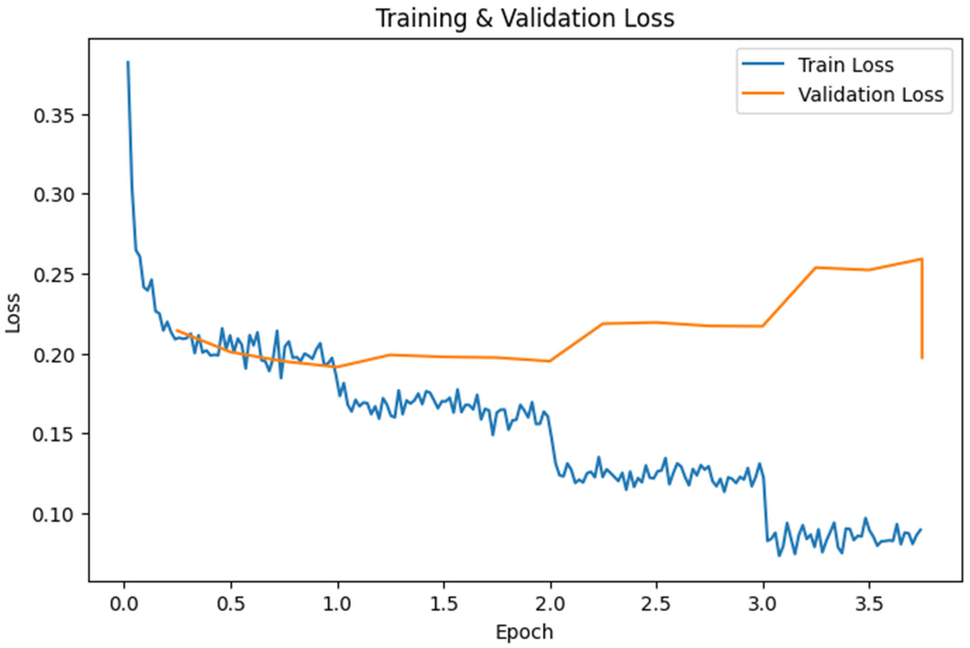 Figure 7. As can be seen from the figure, the training loss dropped rapidly from the initial epochs, while the validation loss followed a not-so-similar trend, but fluctuating at moderate levels. The model reached its lowest validation loss and highest F1-score around the 3rd–4th epoch.