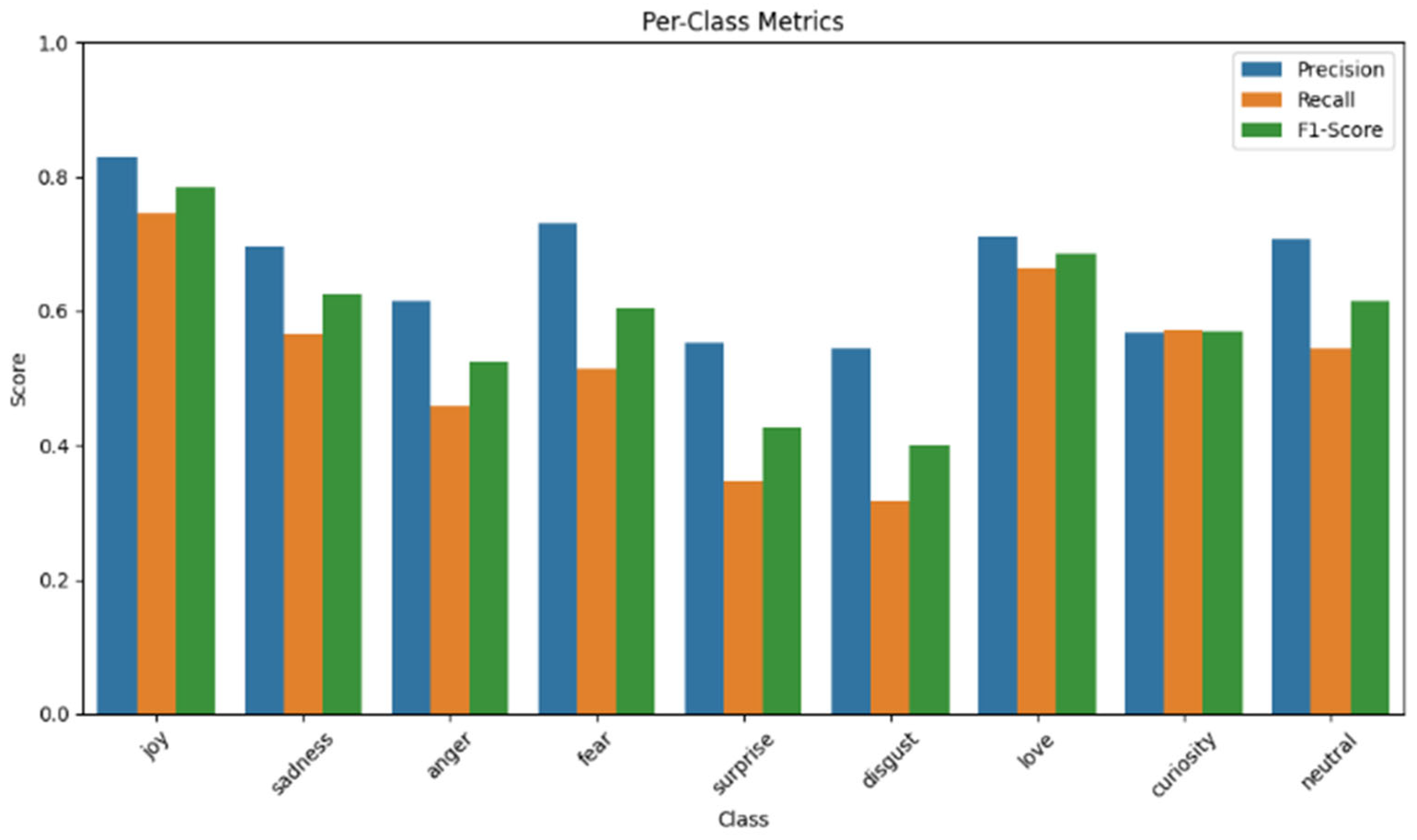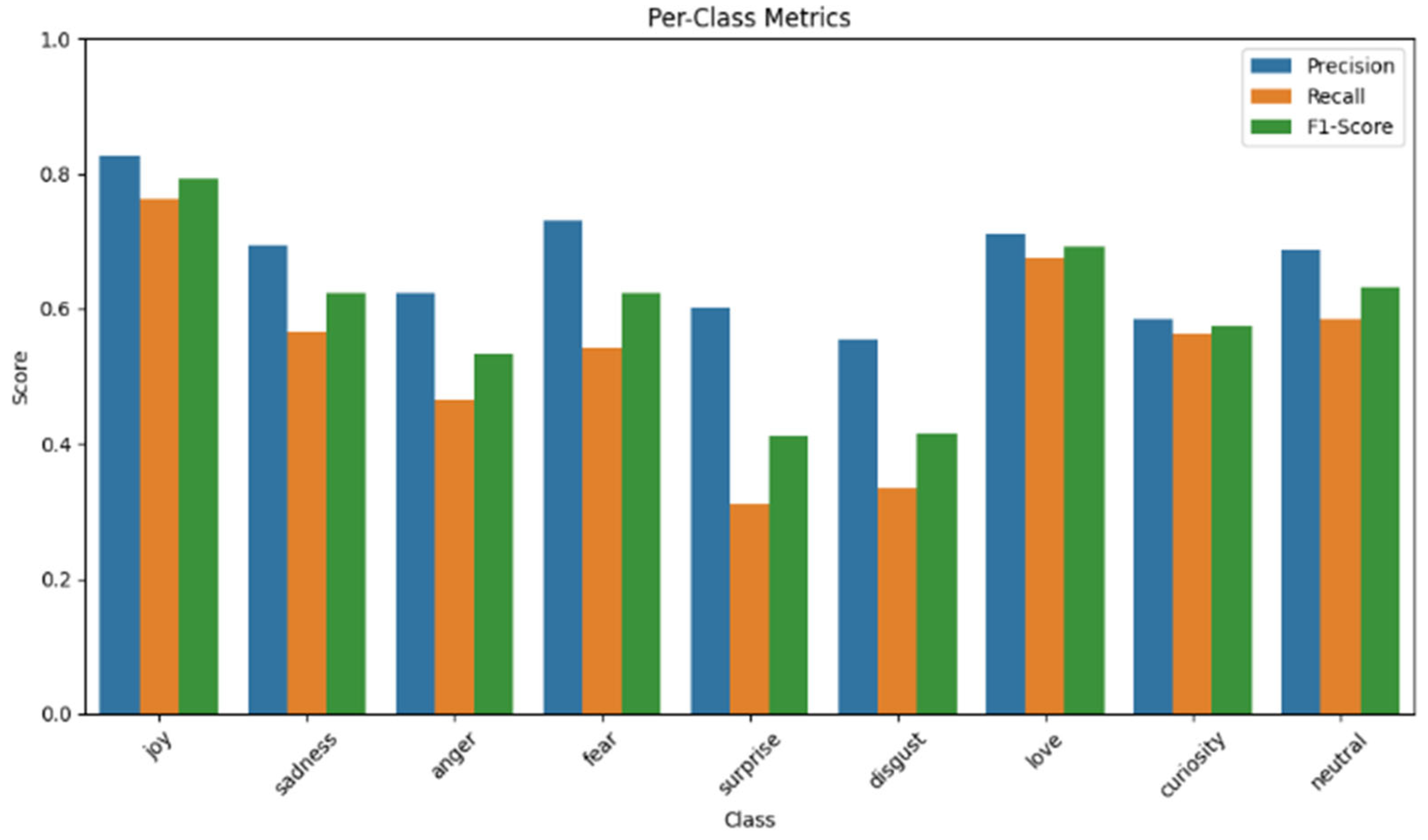 love, curiosity, neutral: These three classes have higher complexity as they span both positive and neutral emotions. love exhibits a fairly stable performance with a 68% F1-score, while curiosity (58% F1) and neutral (62% F1) classes are also at reasonable levels.
