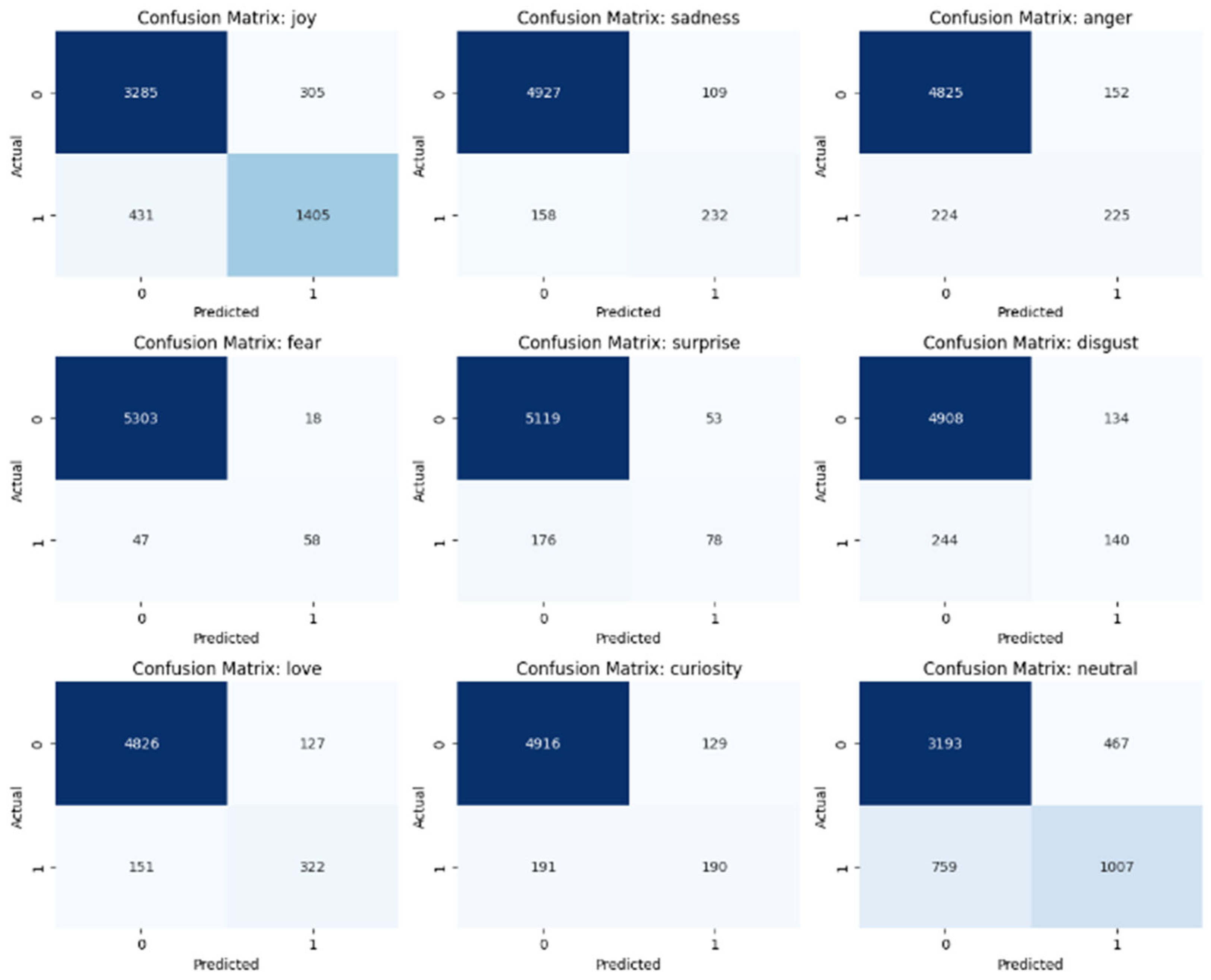 The binary confusion matrices created for each emotion class show the model’s performance over two classes: the current emotion (1) and all other emotions (0). Each matrix focuses on a single emotion, where the label “1” denotes the presence of the target emotion (such as joy), and “0” aggregates all other emotions into a single opposing class. In this setup, four key outcomes define the model’s success and error rates. A True Positive (TP) occurs when the model correctly identifies an instance of the target emotion as “1.” A False Negative (FN) happens when the model incorrectly predicts “0” for an instance that actually belongs to the target emotion. A True Negative (TN) is recorded when the model correctly classifies instances of other emotions as “0.” Finally, a False Positive (FP) arises when the model incorrectly assigns a “1” label to an instance that does not belong to the target emotion.