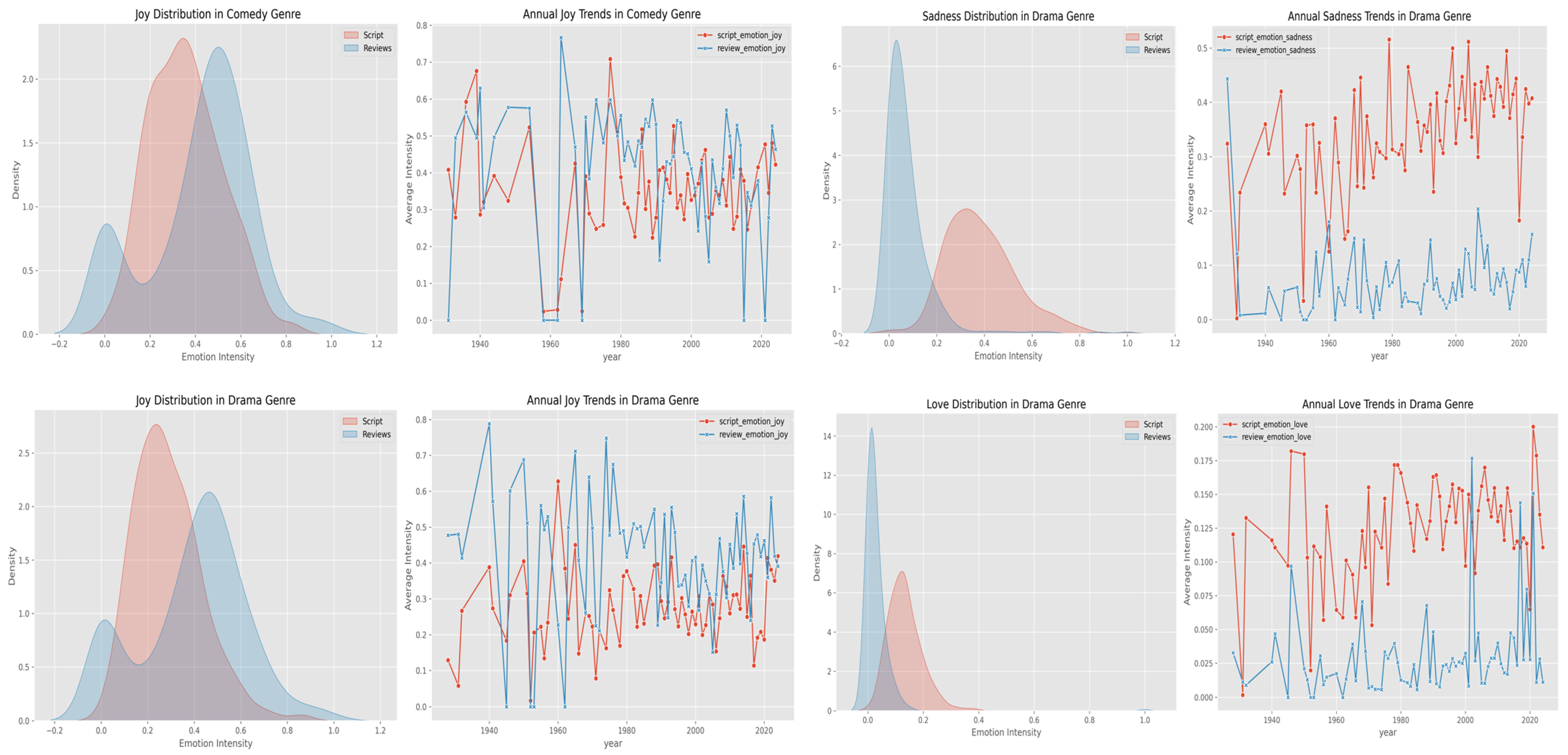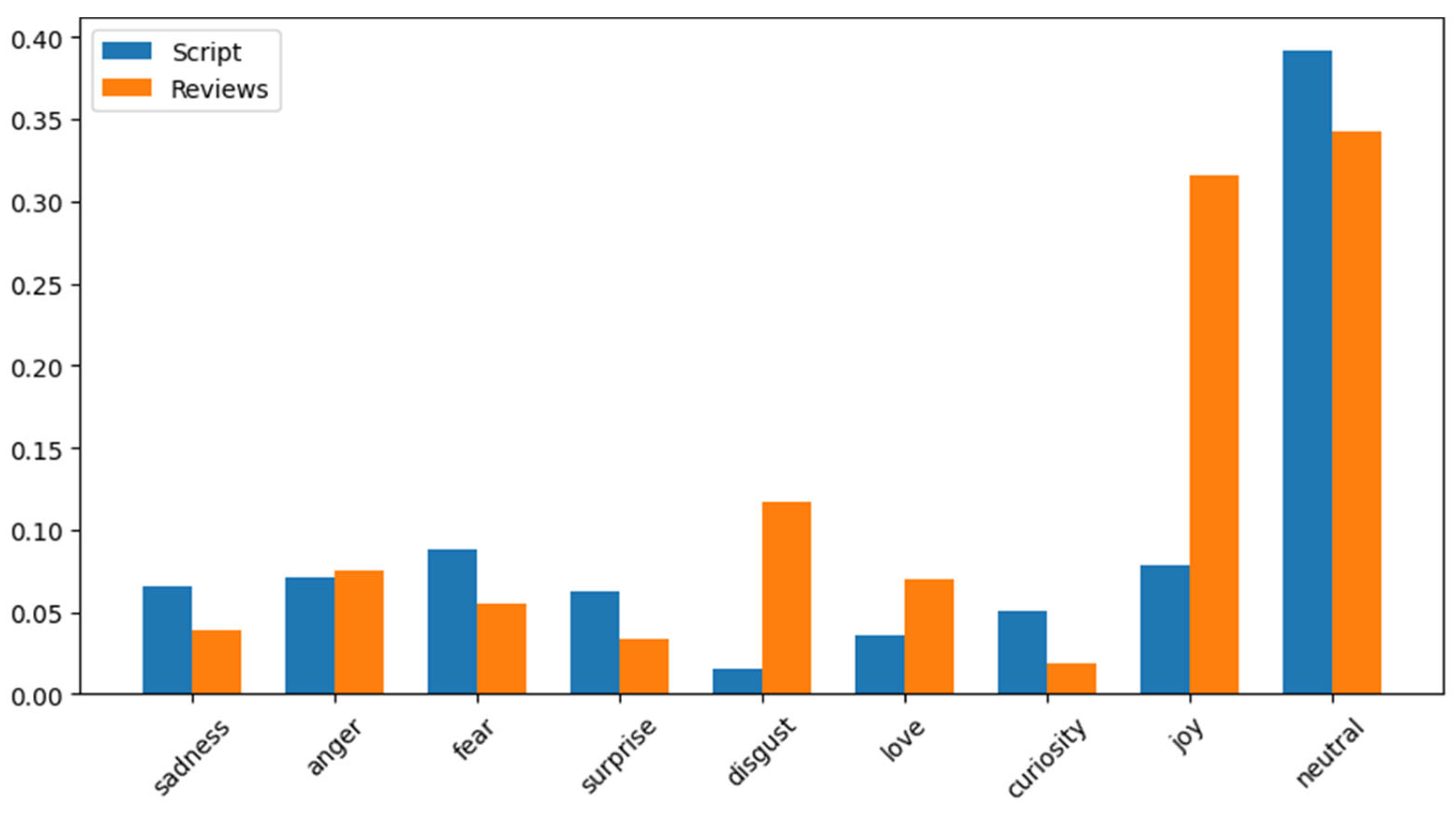 Model evaluation indicated that frequent categories such as joy, sadness, and anger were classified with relatively high reliability, while minority categories such as disgust and surprise yielded lower accuracy due to data sparsity and the inherent ambiguity of emotional expression in user-generated texts. This distribution of results is typical in multi-label emotion analysis and reflects the natural imbalance of affective states in real-world systems. Importantly, the overall performance was sufficiently stable to support large-scale comparative analysis, enabling the detection of systemic patterns of alignment and divergence across scripts and audience reviews.