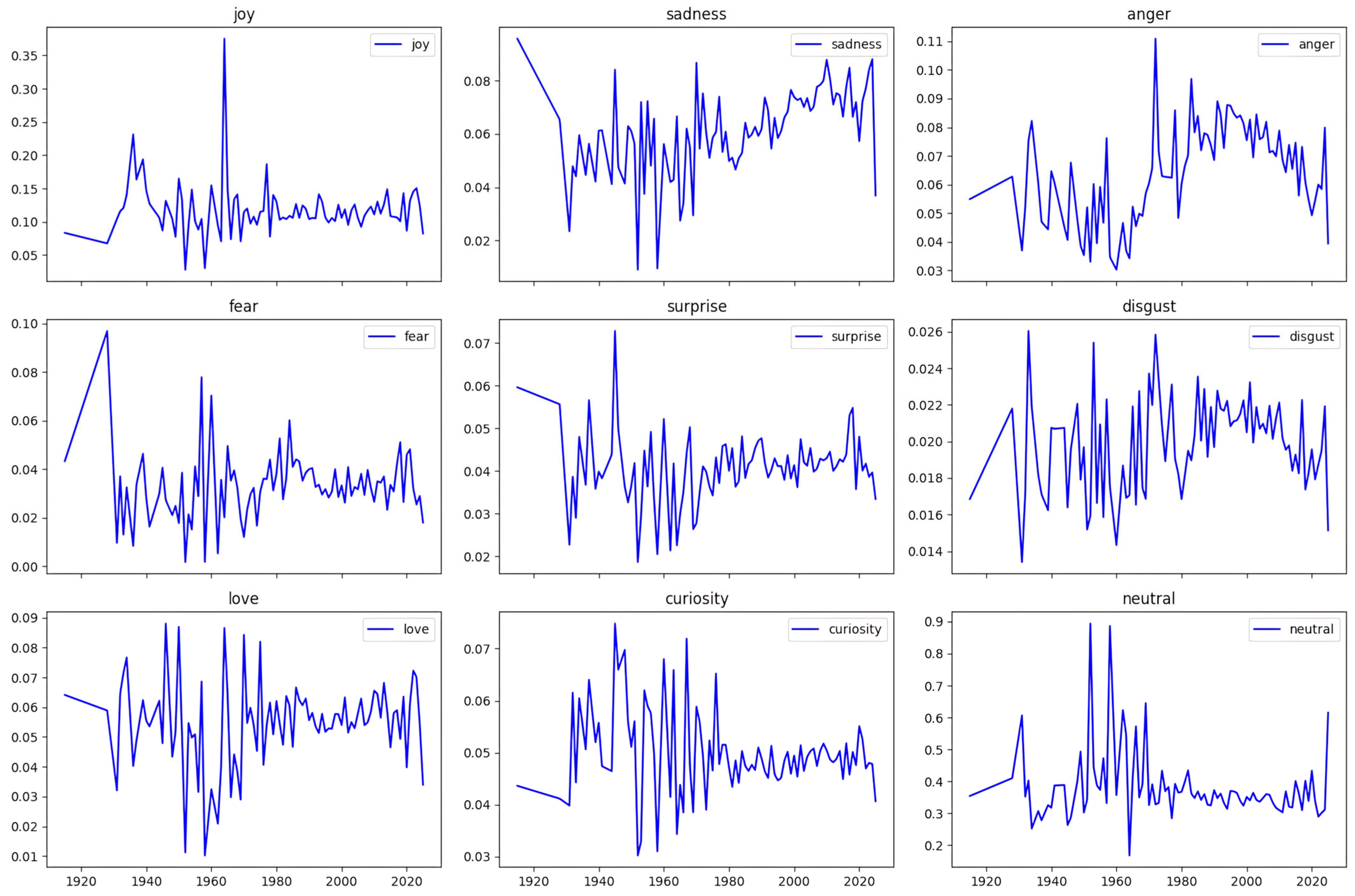 The GoEmotions dataset originally offers 27 distinct emotion labels and a neutral category. However, for the purposes of this study, it was necessary to convert this broad spectrum of emotions into a more manageable subset. Specifically, to identify clear emotional axes that can be tracked in film scripts and user reviews, similar or overlapping emotions were combined, thus defining nine main emotion categories: