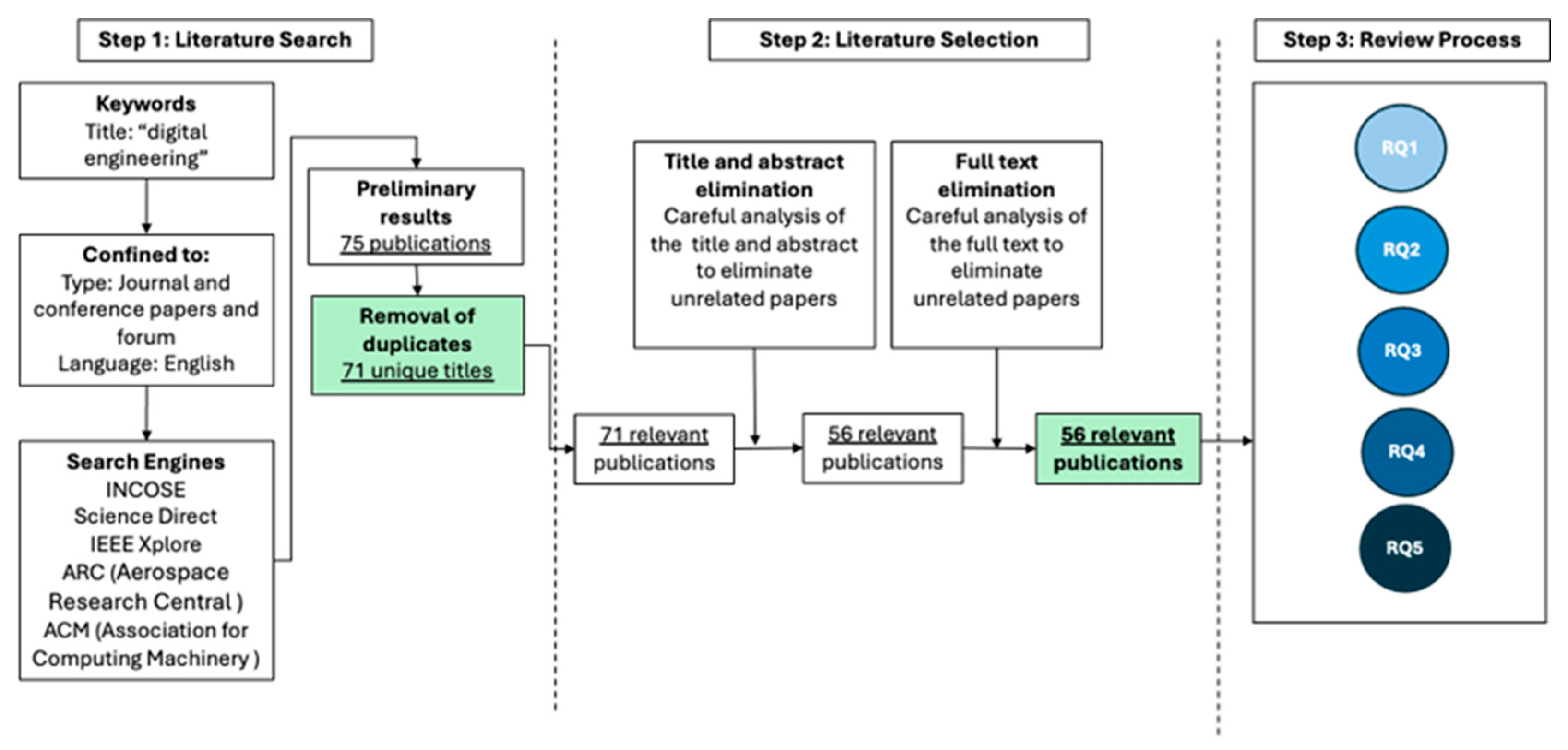 34]. Therefore, to ensure conceptual clarity and comparability across studies, the exact core search string used in each database was the phrase “Digital Engineering,” applied to the article title field. This decision was intended to capture literature that frames Digital Engineering as a central construct, rather than tangentially related concepts such as MBSE, digital twins, or digital threads, which, while integral to DE, could otherwise dilute the scope of analysis. We acknowledge that this choice narrows the corpus and that future work could extend the search to title, abstract, and keyword fields to assess broader interpretations of Digital Engineering. The database search was performed on 3 October 2024. The search initially identified 75 publications. After duplicate removal, 71 unique titles remained. Only English-language journal articles, conference papers, and forum publications were considered.