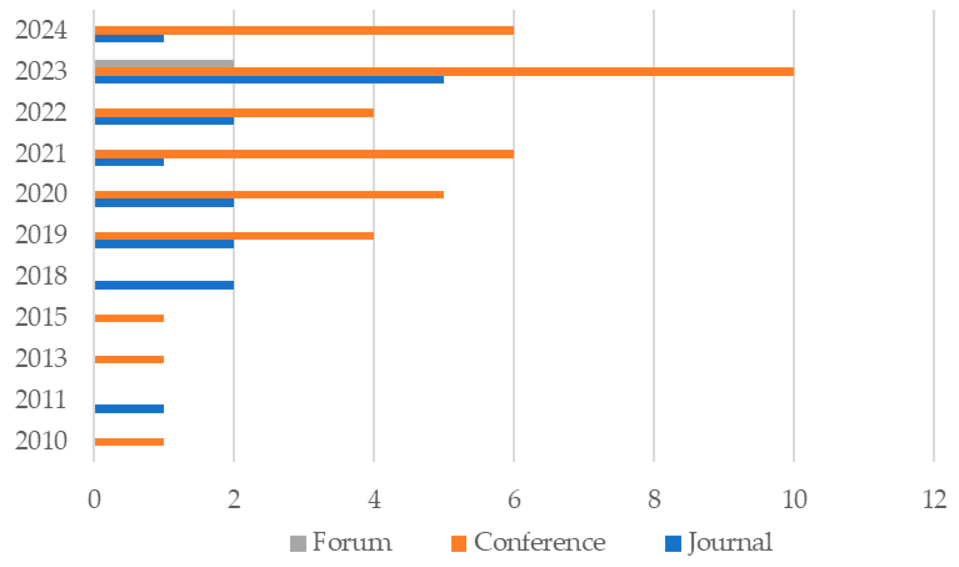 Figure 3 illustrates the distribution of publications over time, categorized by type (conference papers, journal articles, and forums). The graph reveals a sharp increase in conference papers beginning in 2019, immediately following the release of the 2018 DoD Digital Engineering Strategy, suggesting that the strategy significantly influenced academic and professional interest in DE. Since the search criteria specifically targeted papers with “Digital Engineering” in the title, the temporal shift in output reflects how the DoD Strategy catalyzed scholarly engagement with the topic.