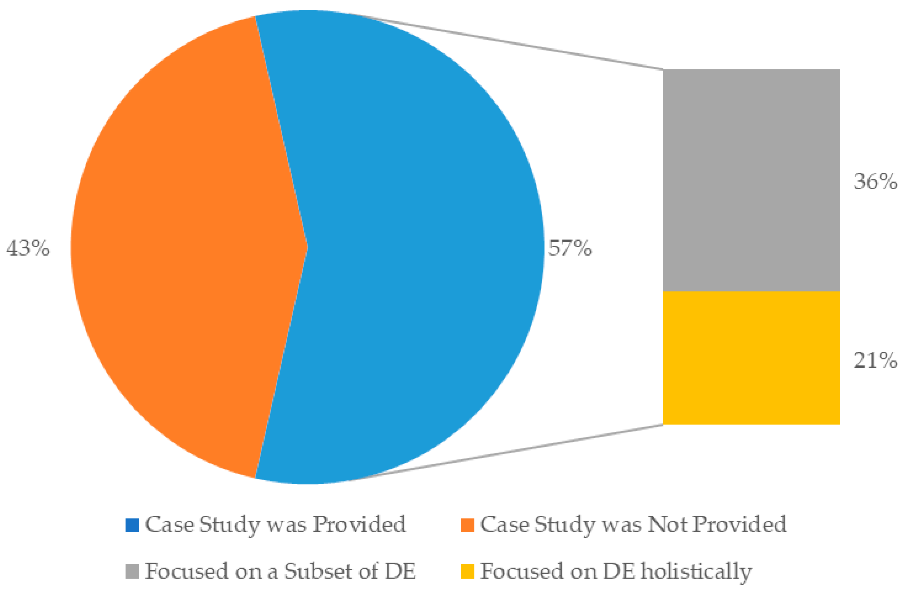 Figure 4, among the 56 papers, 32 (57%) included such case studies, while 24 (43%) did not. This suggests that although more than half of the literature grounds its findings in practical applications, a significant portion remains primarily conceptual or theoretical, reflecting an ongoing need to strengthen empirical validation in the DE domain. Among the 32 case study papers, we further distinguished between “general DE” applications and those focusing on specific “subsets of DE”. General DE case studies (12 papers, 36%) approached DE holistically, often demonstrating organization-wide integration, cultural adoption, or lifecycle benefits without anchoring the analysis to one specific methodology. In contrast, the majority of case studies (20 papers, 64%) emphasized specific DE subsets, such as MBSE, digital threads, and digital twins. These papers highlighted the tangible advantages of subset adoption, such as improved traceability, real-time monitoring, and lifecycle data continuity. This indicates that while broad DE frameworks provide valuable conceptual direction, research interest has leaned toward showcasing the benefits of targeted DE technologies that can yield immediate organizational gains.