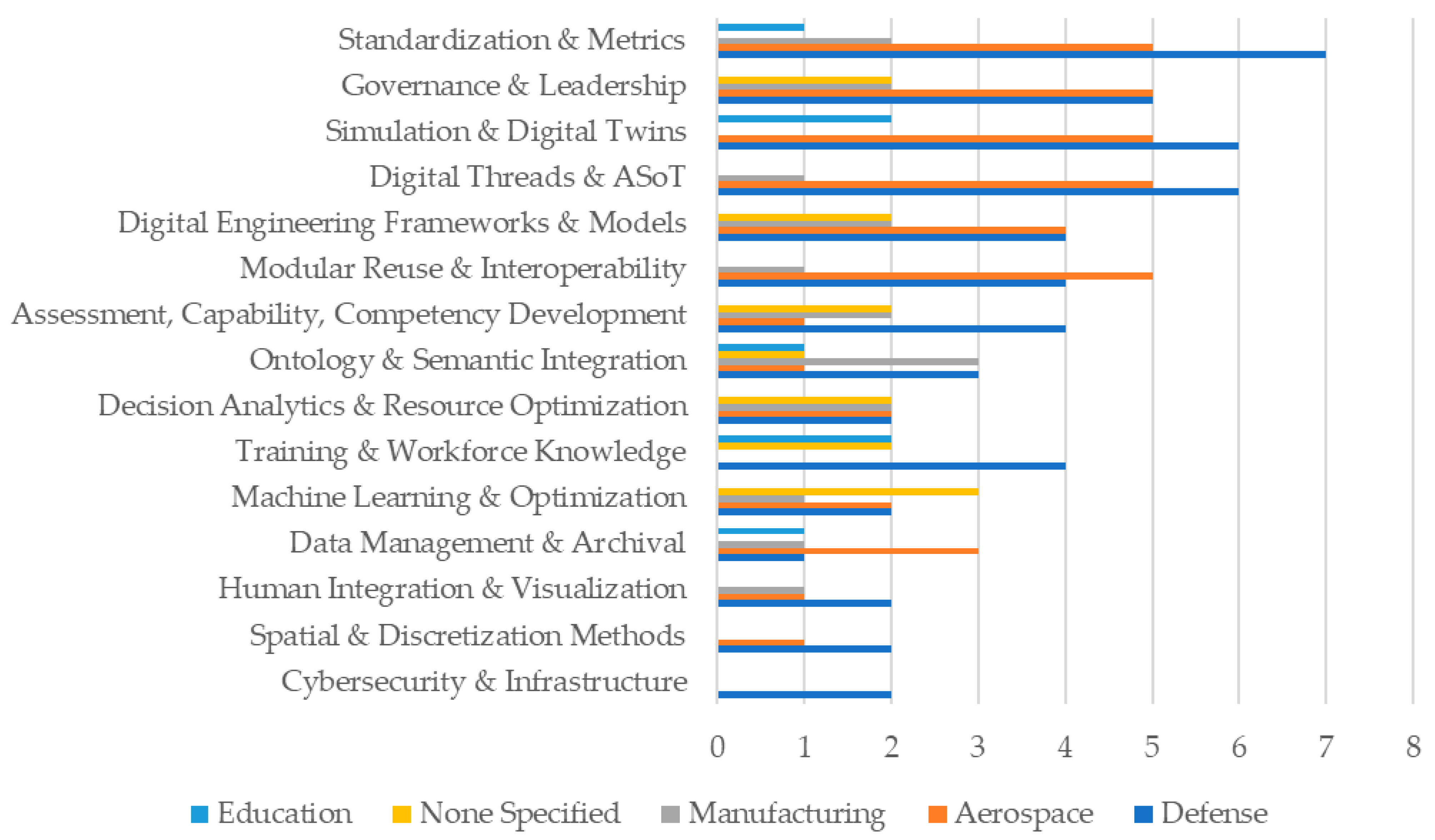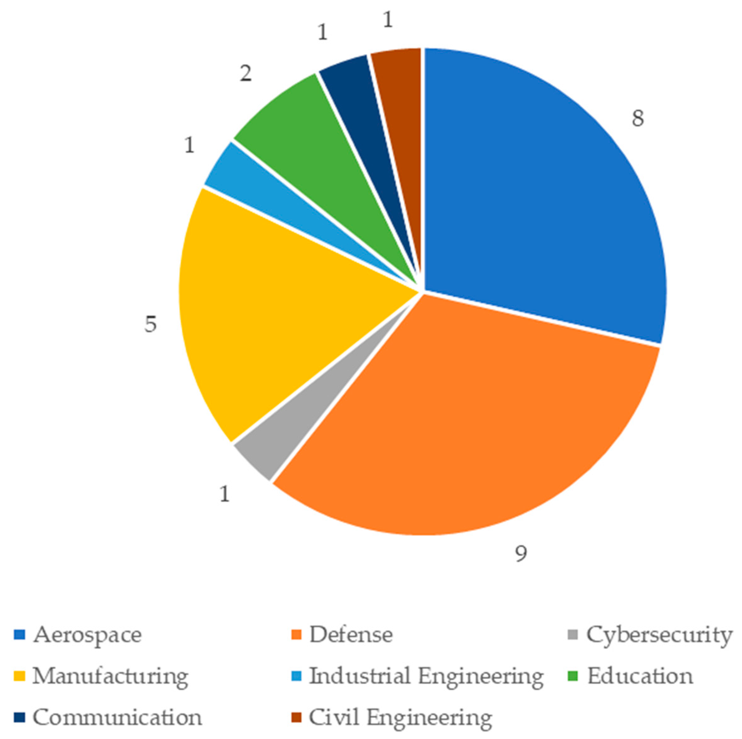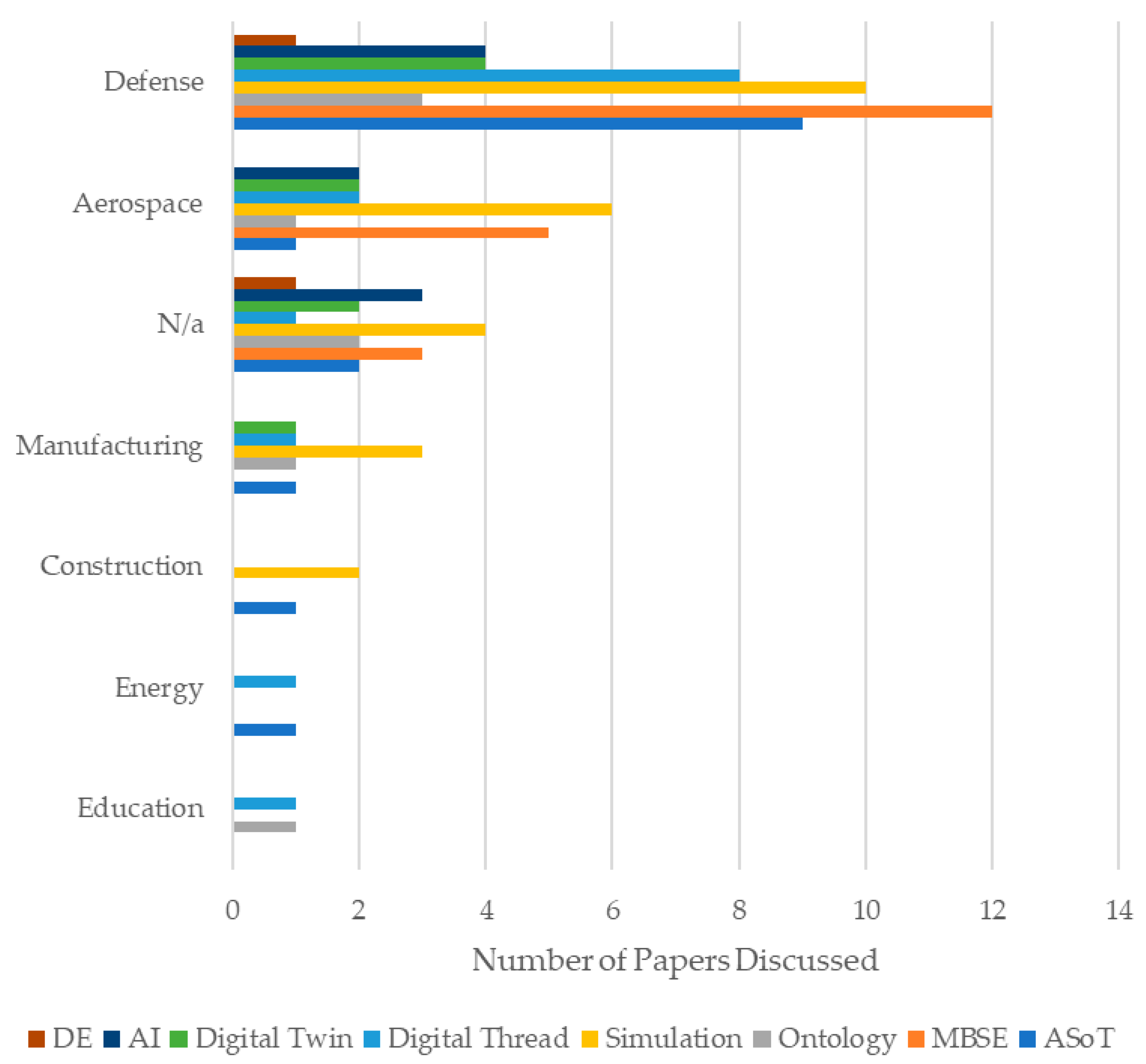 Figure 5, the most frequently represented sectors were defense and aerospace, which reflect the origins of many DE frameworks and tools. The aerospace sector, including aviation, has embraced DE for its ability to enhance safety-critical system design and reduce development costs. Other industries, such as automotive, healthcare, and manufacturing, were represented but to a lesser extent, suggesting that DE adoption outside defense and aerospace remains an emerging frontier.