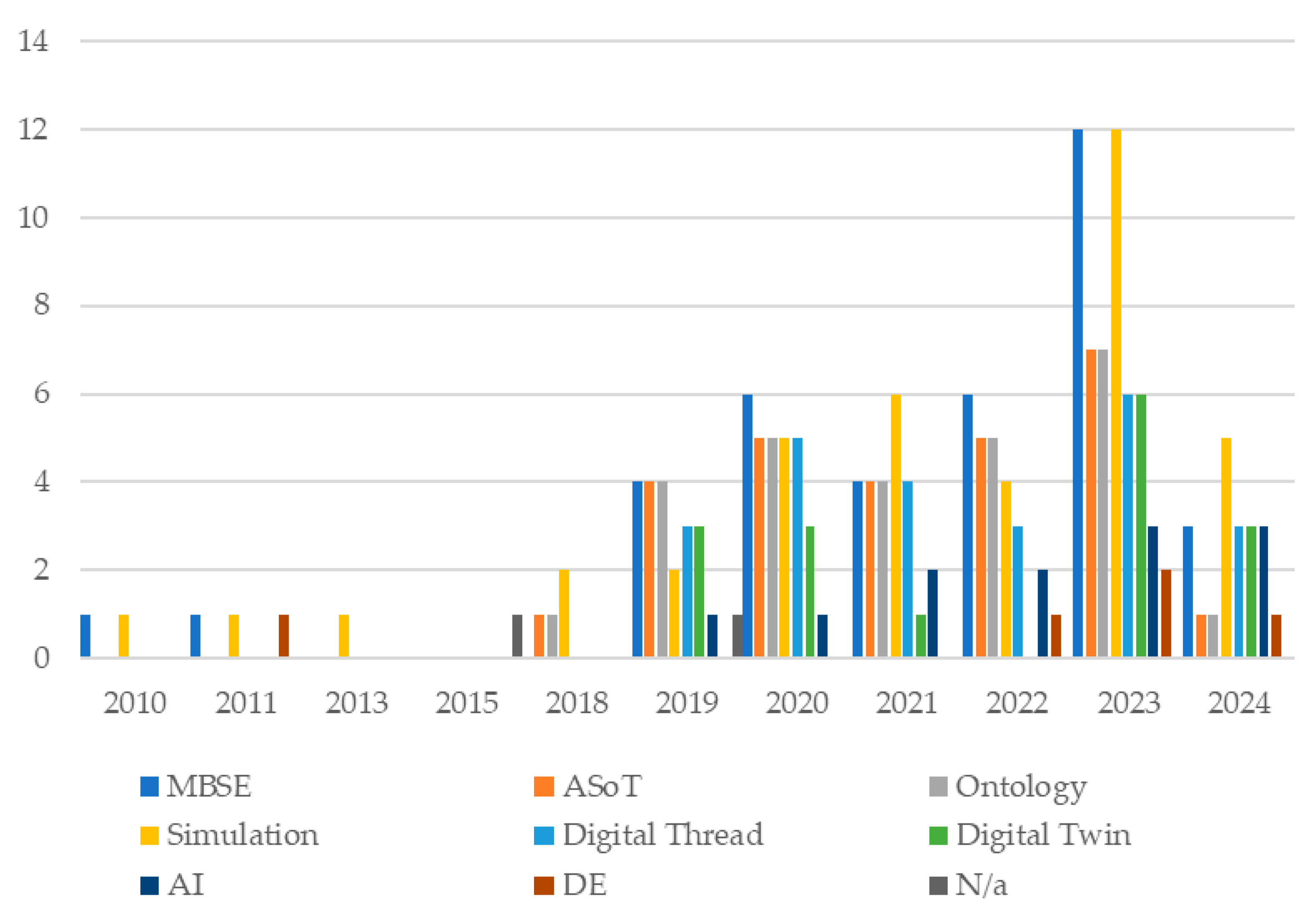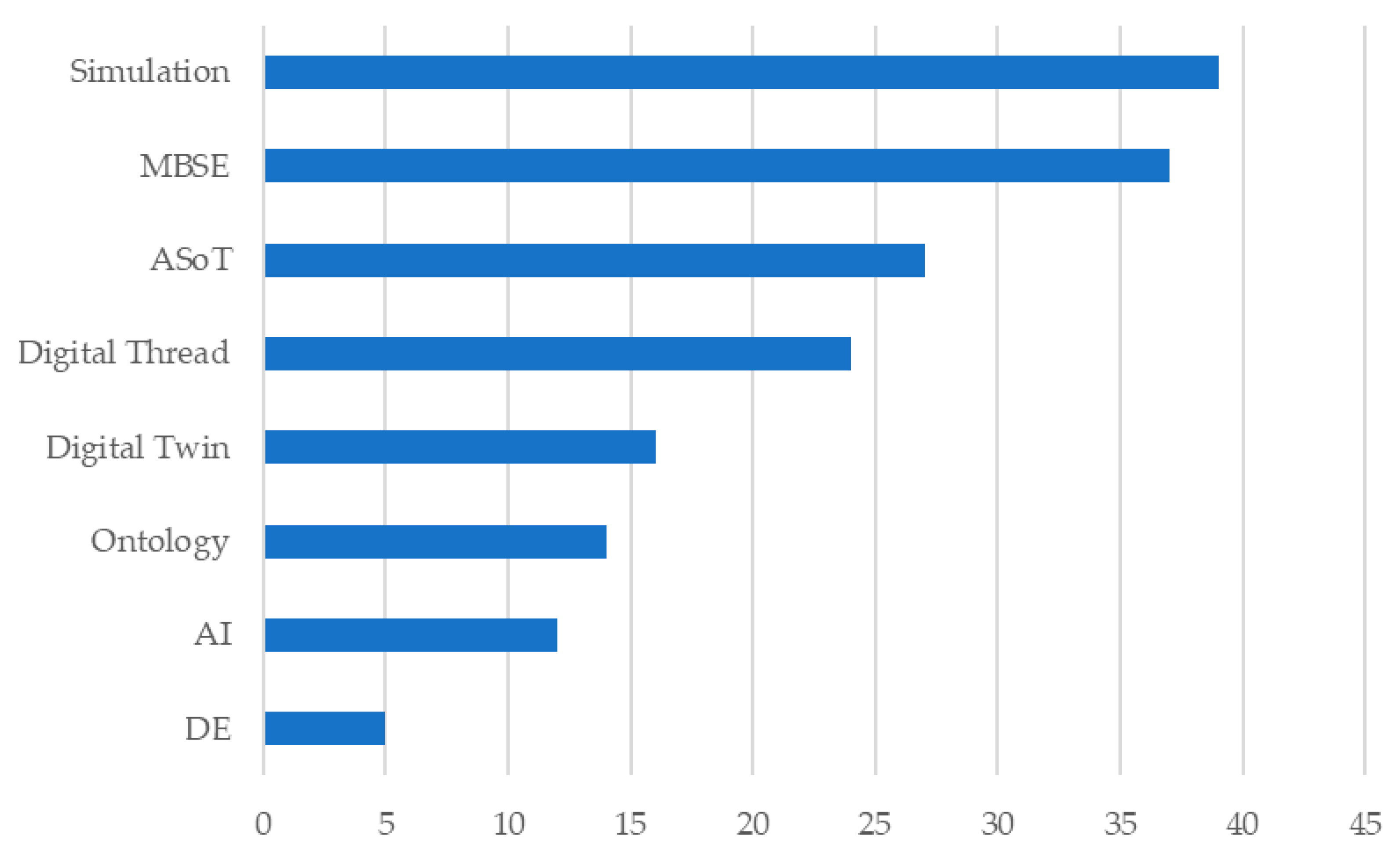Table 3. Notably, 35% of subset case studies centered on MBSE, highlighting the central use of modeling in DE. Other commonly cited subsets included the following: ASOT, simulation, digital threads, and digital twins. Less frequently mentioned subsets included augmented reality, ontology-based modeling, and System of Systems (SoS)/End-to-End (E2E) modeling. The higher number of subset-focused studies highlights an ongoing preference for showcasing the impact of modular, implementable DE technologies rather than organization-wide DE transformations. This could reflect both the complexity of broad DE adoption and the tendency of researchers to focus on more bounded, measurable interventions.