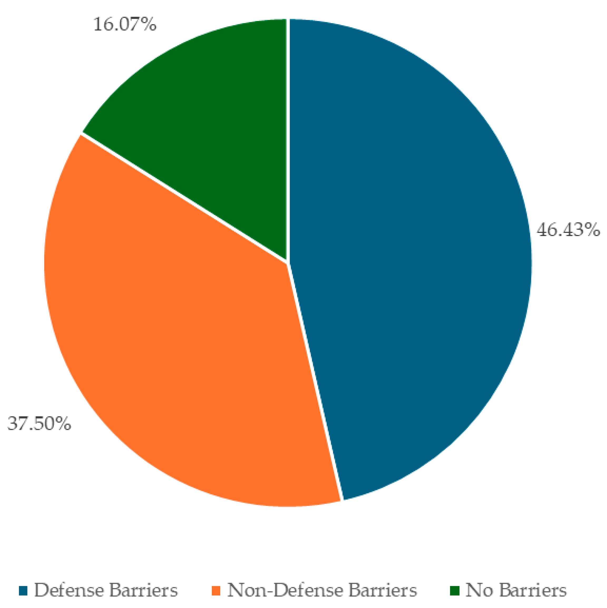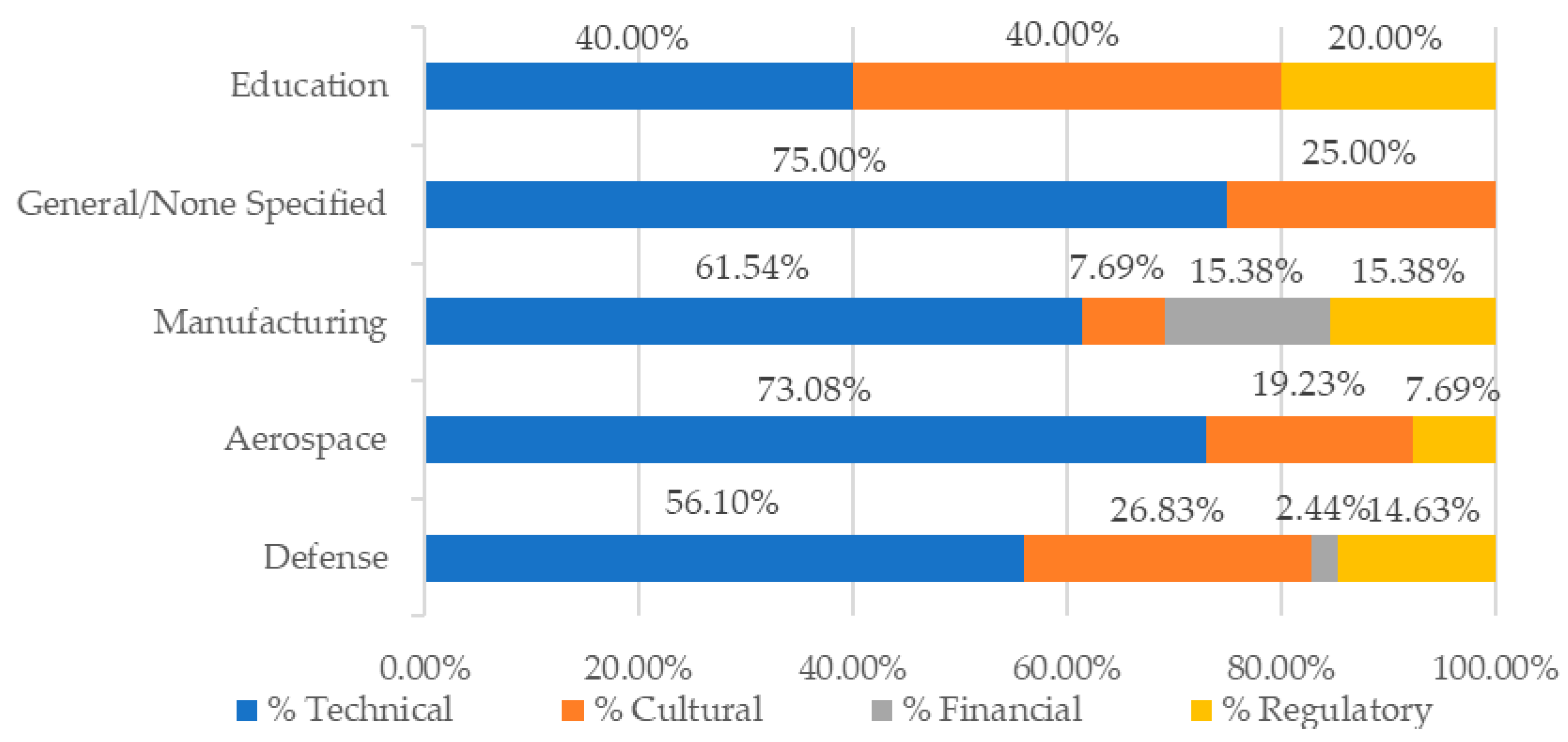 86]. In these cases, the challenge was not the technology itself but the workforce’s readiness and skepticism about DE adoption. These papers said that without sufficient cultural alignment and communication, even well designed DE frameworks will fail. This was 26.9% of the barriers in the defense sector and 19% in the non-defense sector. A third common barrier was the lack of a standard approach to DE. In the defense sector this was mentioned in 10 papers (38.5%) [