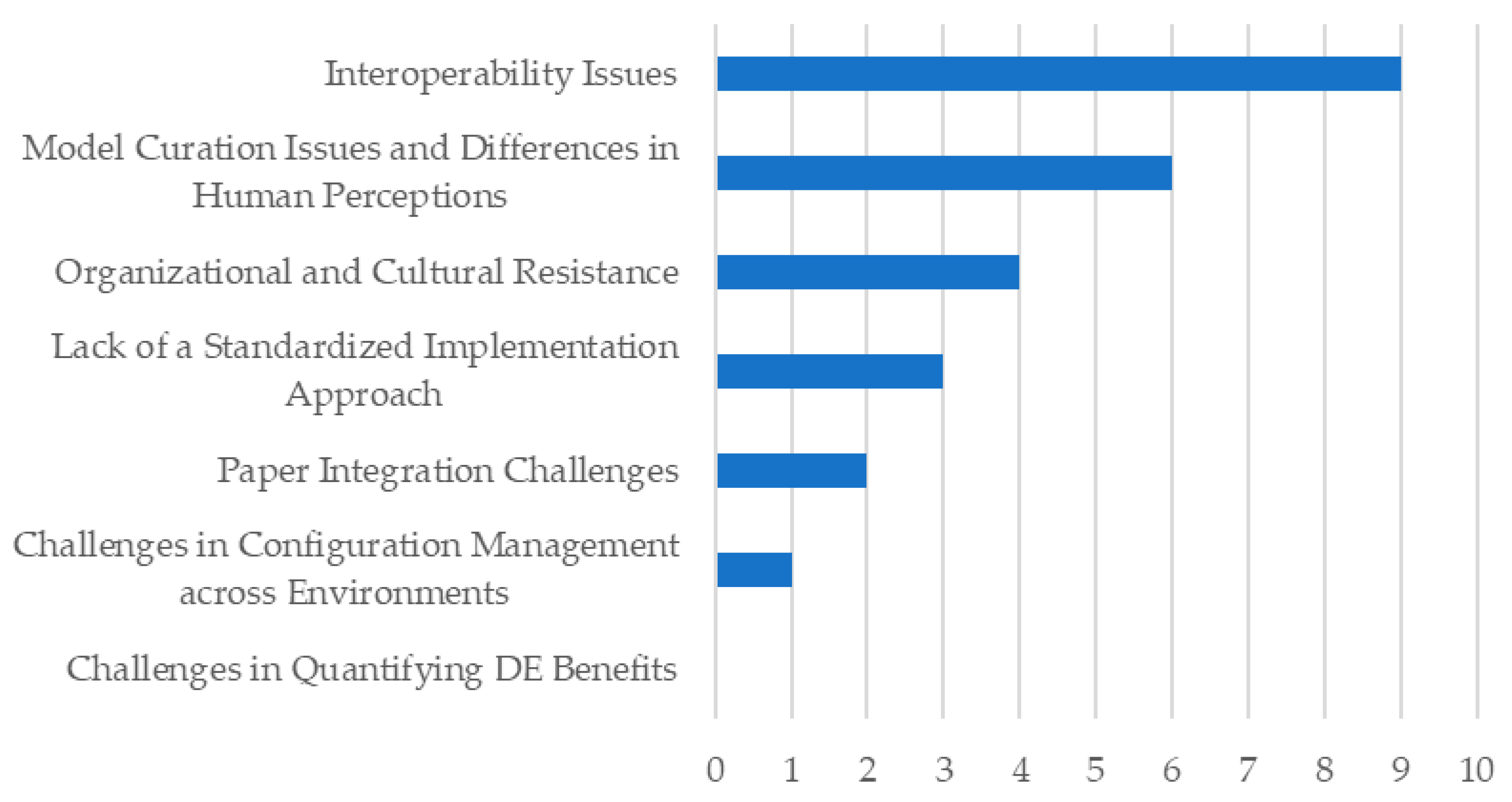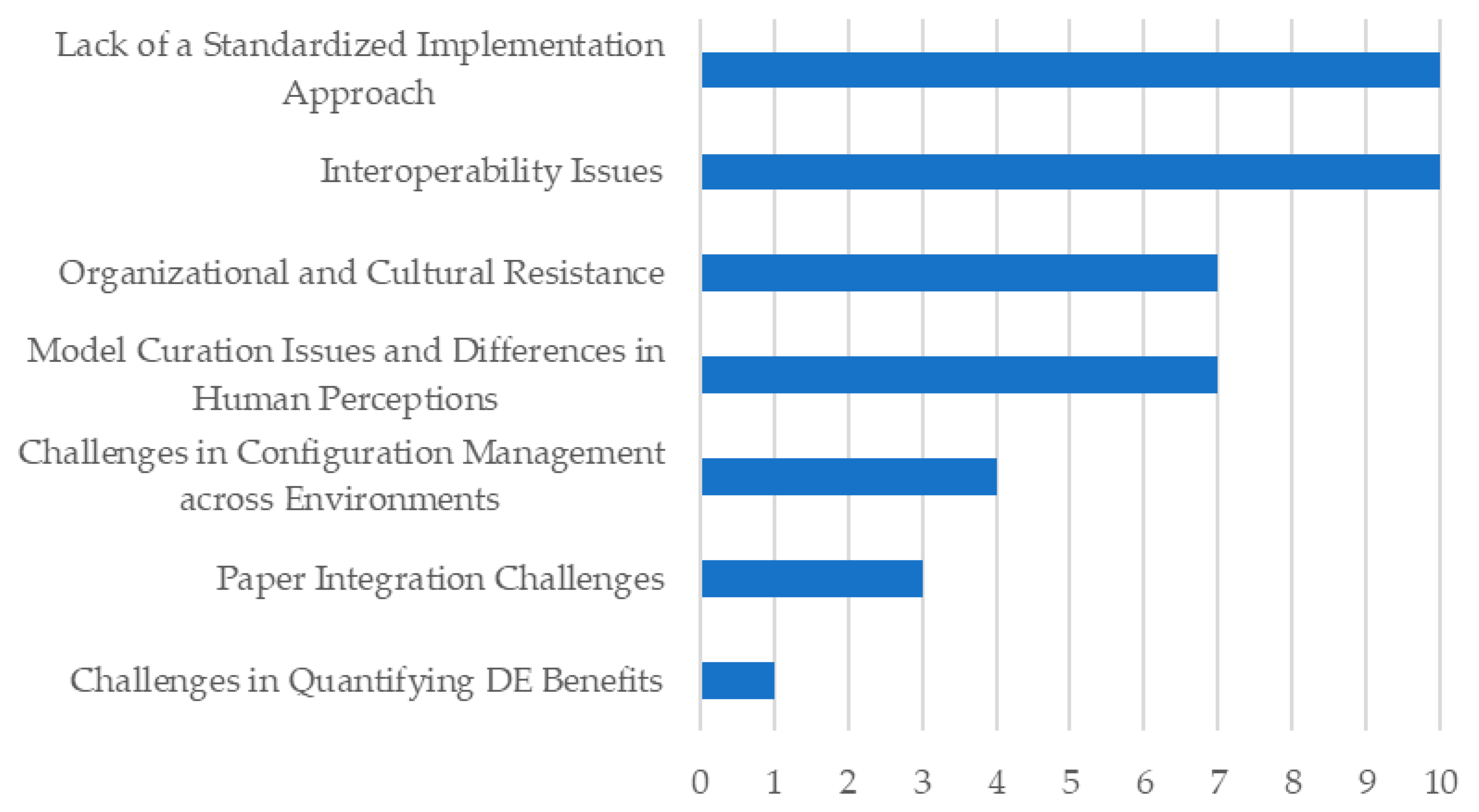Implementation challenges are remarkably consistent across sectors, centered around interoperability limitations, organizational cultural resistance, and a lack of standardization. These issues manifest differently depending on context: defense and aerospace organizations struggle with legacy systems and compliance constraints, whereas manufacturing and education sectors emphasize agility, workforce training, and return on investment. Despite these barriers, the literature demonstrates a growing number of proposed frameworks, signaling an active and evolving research landscape. Yet, the persistent gap between conceptual innovation and operational realization suggests that DE remains in an early phase of adoption, defined more by its promise than by systematically validated results.