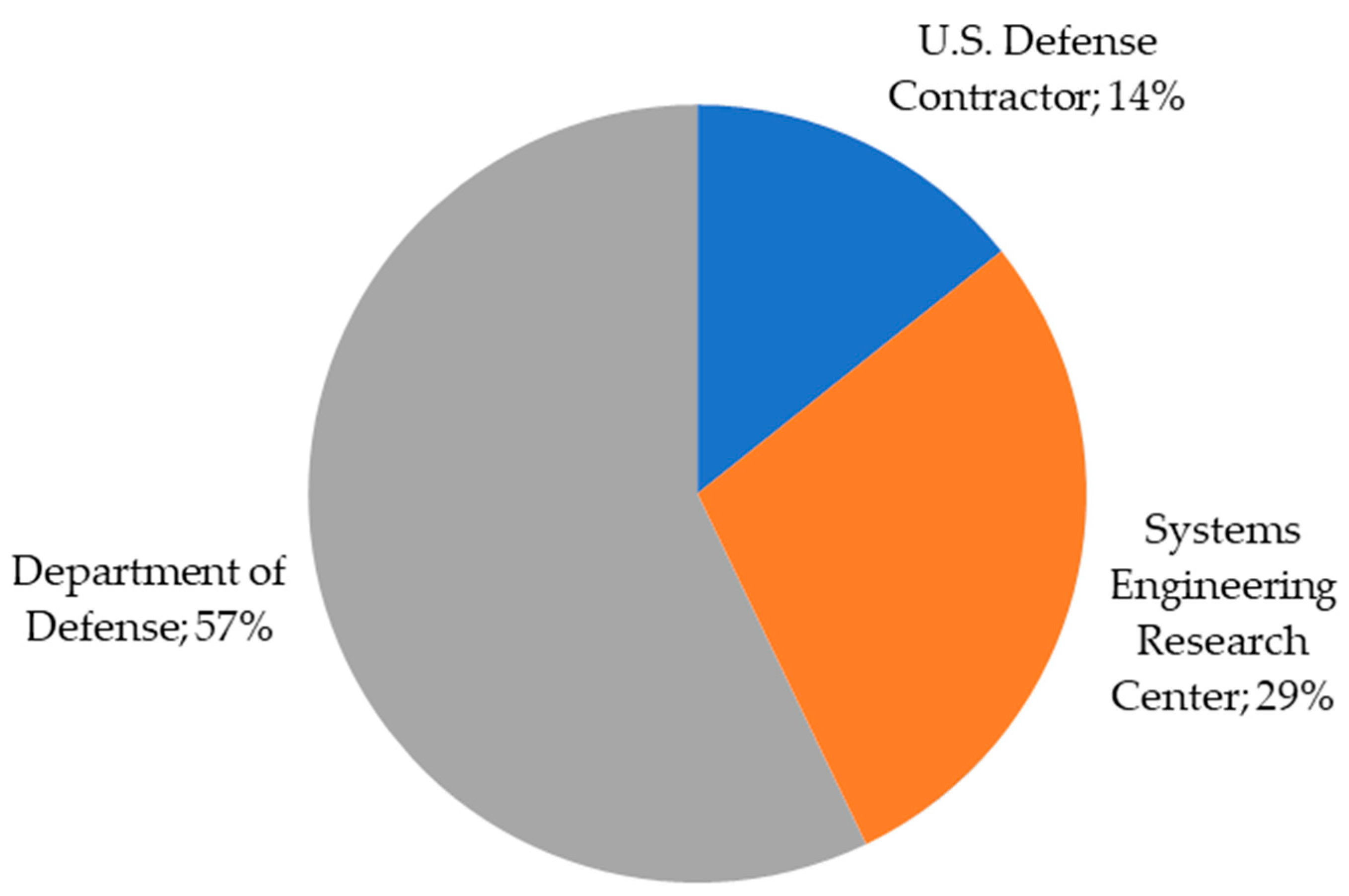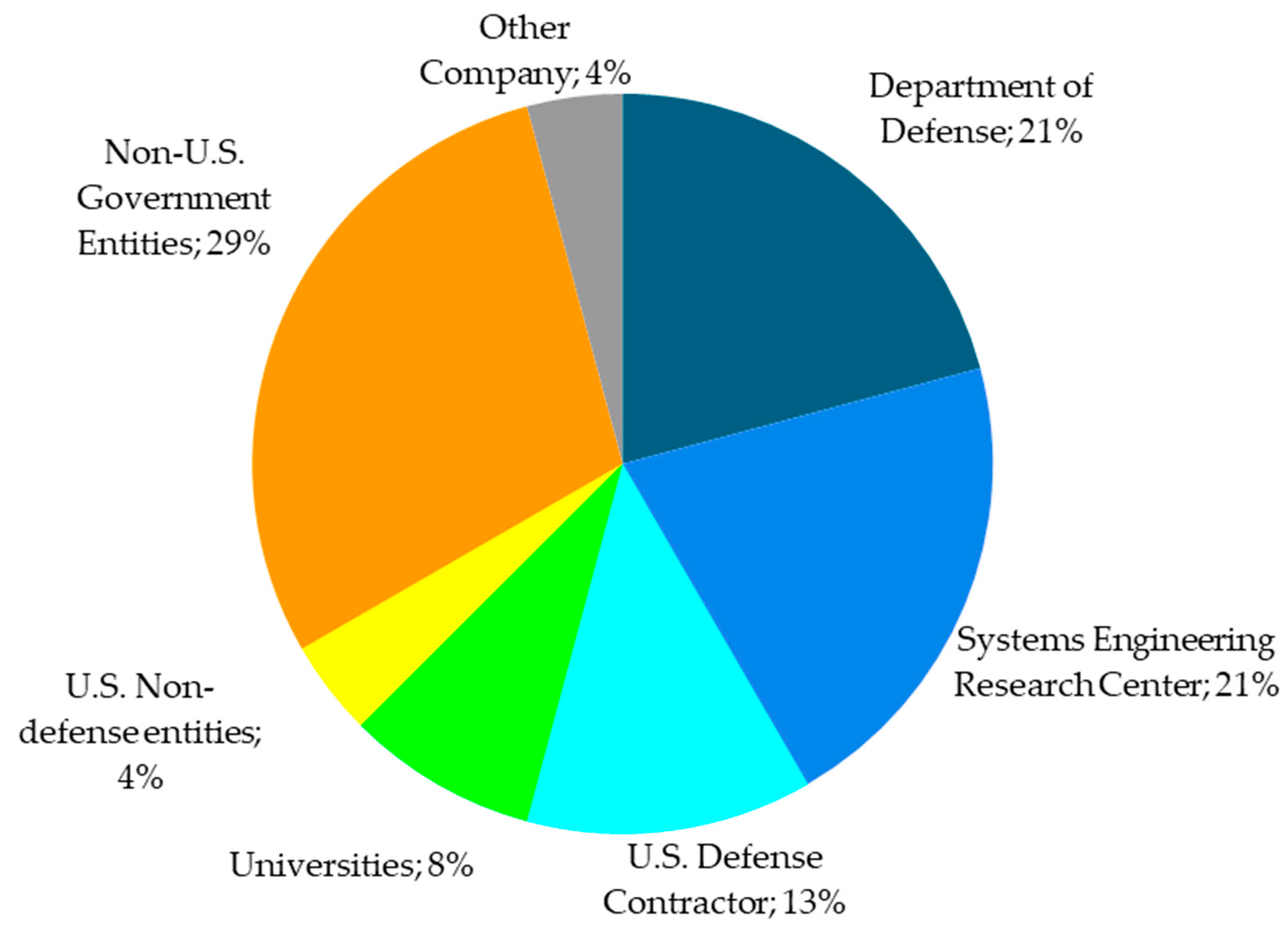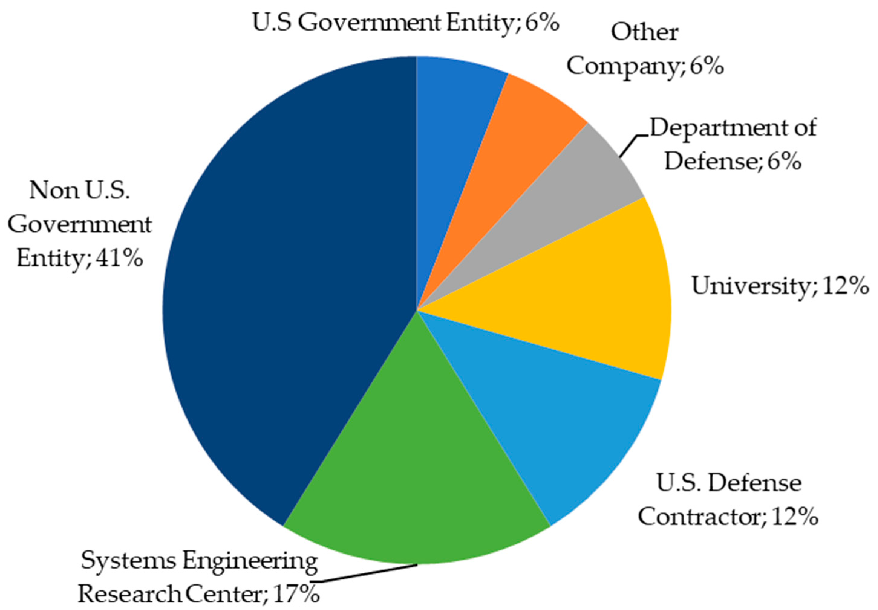 Figure 21 shows the overall distribution of these sources, with non-U.S. government entities (29%) representing the largest share, followed by the Department of Defense (21%), the Systems Engineering Research Center (21%), U.S. defense contractors (13%), universities (8%), and smaller contributions from U.S. non-defense entities (4%) and other companies (4%).