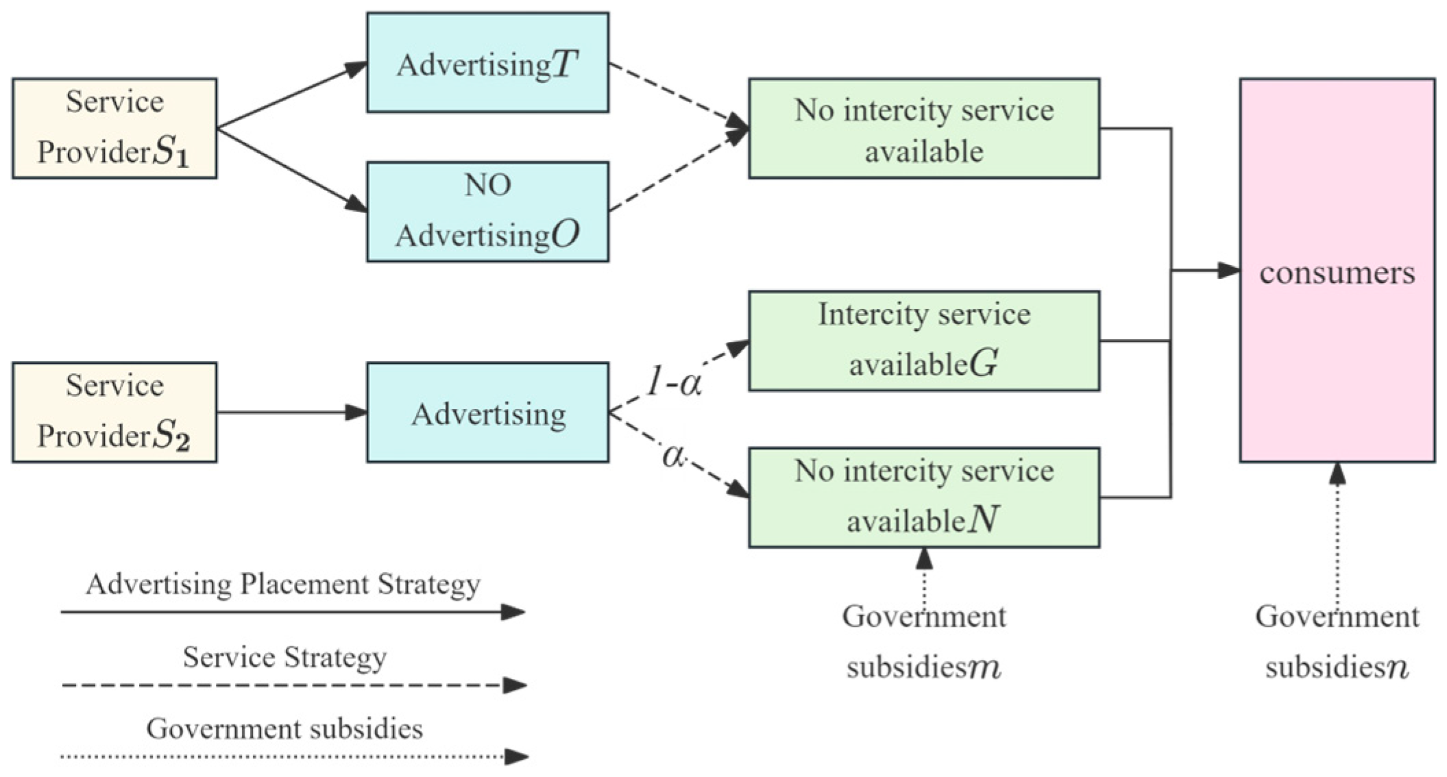 - It introduces two synergistic driving forces—government subsidies and the advertising economy—into the study of duopoly air taxi markets, expanding the dimensions of strategic choice analysis. Previous studies have mostly focused on the technical feasibility of air taxi or the behavior of a single market entity, lacking a unified theoretical framework that accounts for interactions between multiple variables.