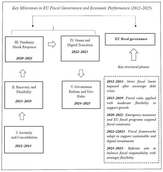The significant structural developments and interdependencies between the economic, institutional, public governance, and social levels during the period 2012–2023 are summarised in Figure 2. This chronological representation highlights the transition from the post-crisis phase, marked by austerity and fiscal consolidation policies, to a phase of recovery and institutional adaptation, culminating in the transition to sustainability and digitalization in the post-pandemic context. From an economic perspective, the period analysed reflects the application of the European Fiscal Compact and, subsequently, the temporary suspension of fiscal rules []. At the institutional and public governance level, the figure illustrates the process of reforming the European fiscal framework and integrating green and digital objectives into budgetary policies []. On the social front, the evolution captures the transformation of public perception of taxation, from an instrument of correction to an instrument of sustainability and equity. Overall, the figure highlights the dynamic and interconnected nature of the transformations in the European Union, providing a visual basis for analysing the relationship between taxation, economic growth, and societal resilience.