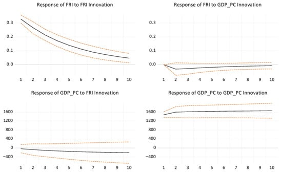 Table 7 was segmented into two sections, thus analysing the impact of shocks on both the FRI and GDP per capita. The variance decomposition analysis, performed over a relative forecast horizon of 12 periods, revealed distinct dynamics, but also a limited interdependence between the FRI and GDP per capita. In the case of the FRI, the standard error of the forecast showed a constant increase, from 0.328986 in the first period to 0.560147 in the last period, thus reflecting long-term uncertainty. The contribution of the FRI’s own shocks to the forecast error variance was dominant, representing 100% in the first period and remaining over 98.9% even at the maximum horizon of 12 periods, suggesting that its own internal dynamics almost entirely determine variations in this index. In contrast, the contribution of GDP per capita to the forecast error variance of the FRI was negligible, increasing from 0% to approximately 1.05% over the 12 periods. Similarly, regarding GDP per capita, the standard error of the forecast increased from 1479.261 to 5668.407 over the same horizon, indicating increasing predictive uncertainty. The contribution of the FRI to the forecast error variance of GDP per capita was also minimal, rising from approximately 0.05% to 1.04% over the 12 periods. Variations in GDP per capita were predominantly explained by its own dynamics, with a contribution of own shocks of 99.95% in the first period and over 98.9% over the entire forecast horizon. These results suggest the autonomy of each variable, with a marginal reciprocal influence within the analysed model.