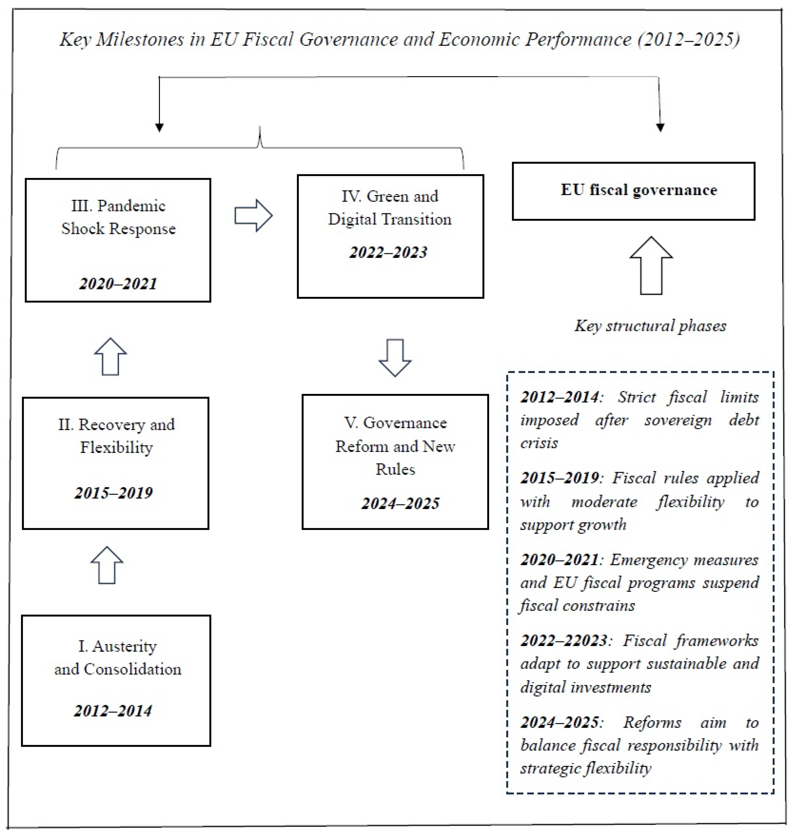 Figure 2. This chronological representation highlights the transition from the post-crisis phase, marked by austerity and fiscal consolidation policies, to a phase of recovery and institutional adaptation, culminating in the transition to sustainability and digitalization in the post-pandemic context. From an economic perspective, the period analysed reflects the application of the European Fiscal Compact and, subsequently, the temporary suspension of fiscal rules [