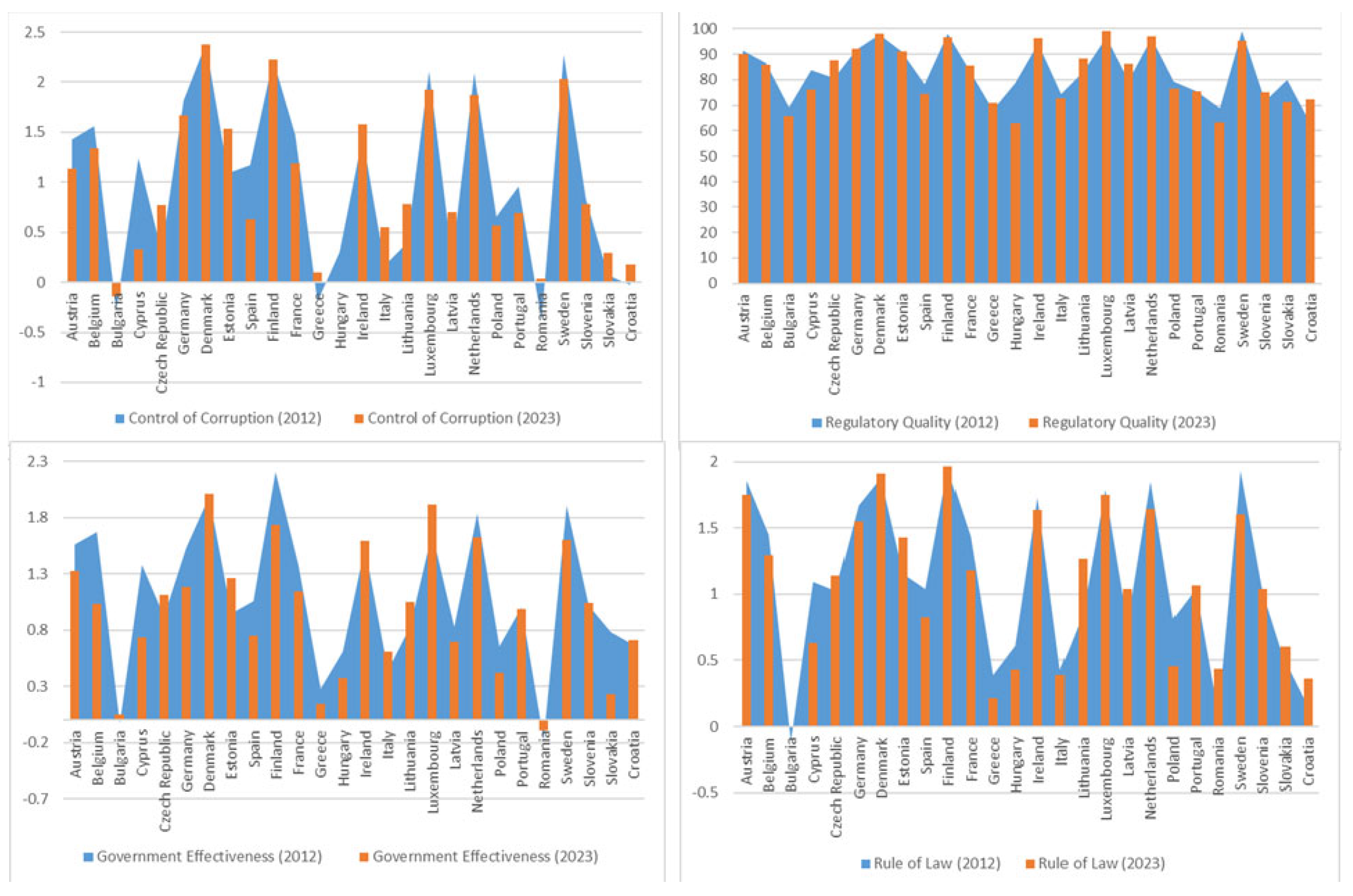 Figure 5) were chosen to capture the institutional environment in which tax rules operate. These indicators provide information on the quality of public administration, the strength of institutional frameworks, and the enforcement mechanisms that can support or undermine the effectiveness of fiscal regulations. A comparative analysis of these indicators for the period 2012–2023 shows a general trend of improvement, reflecting the gradual strengthening of governance in EU member states.