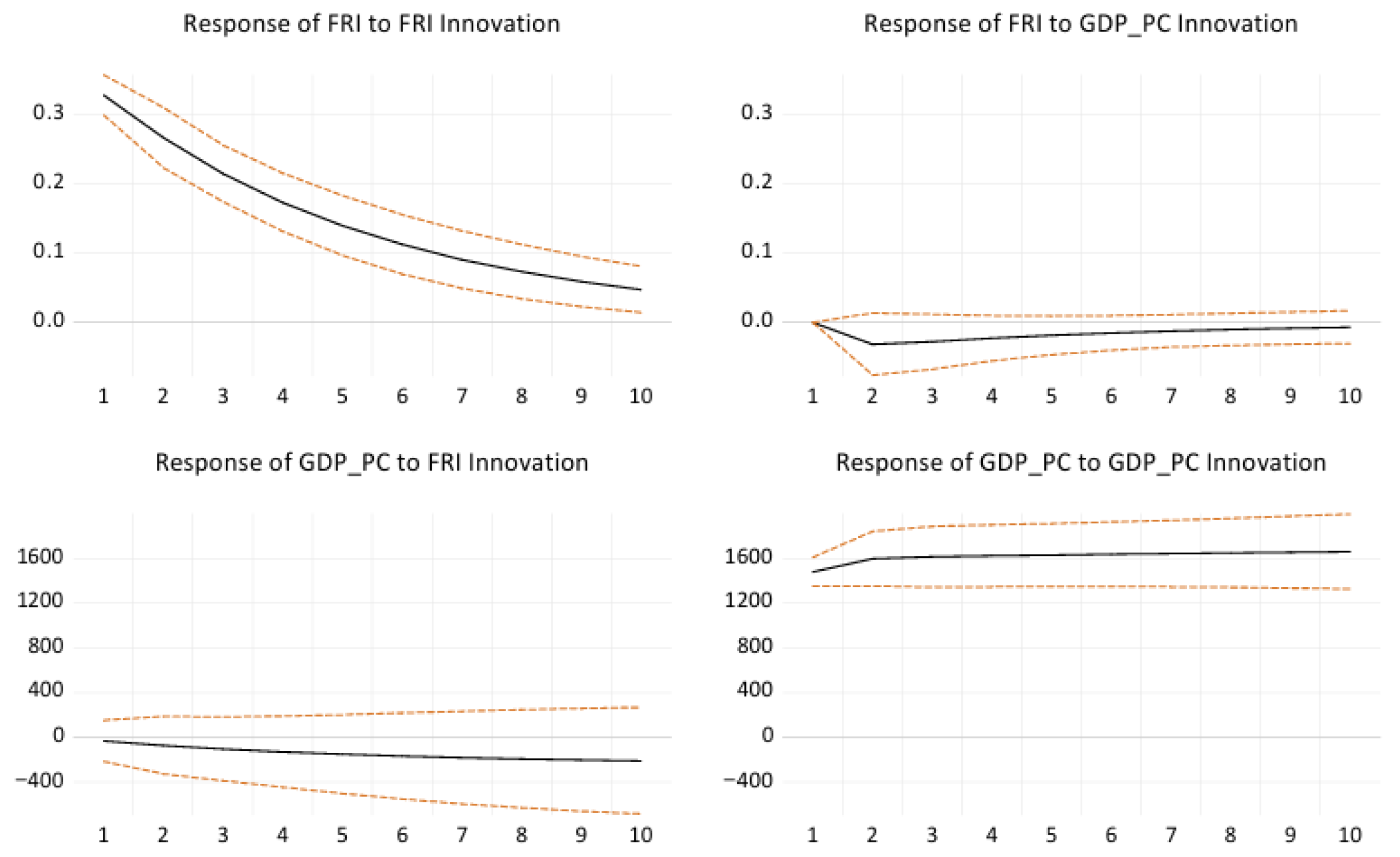 Table 3) leads to a rise in the FRI. Other direct and significant causal relationships between FRI and GDP per capita, or vice versa, were not evidenced in the VAR model estimations. (ii) Both variables are predominantly influenced by their own past values, rather than significantly influencing each other within this model. Therefore, based on the presented estimates, we cannot affirm the existence of a strong and statistically significant bidirectional causal relationship between the FRI and GDP per capita. Our findings are supported by numerous studies that utilise similar methodologies, such as Granger causality tests and vector autoregression models, to explore macroeconomic interdependencies [