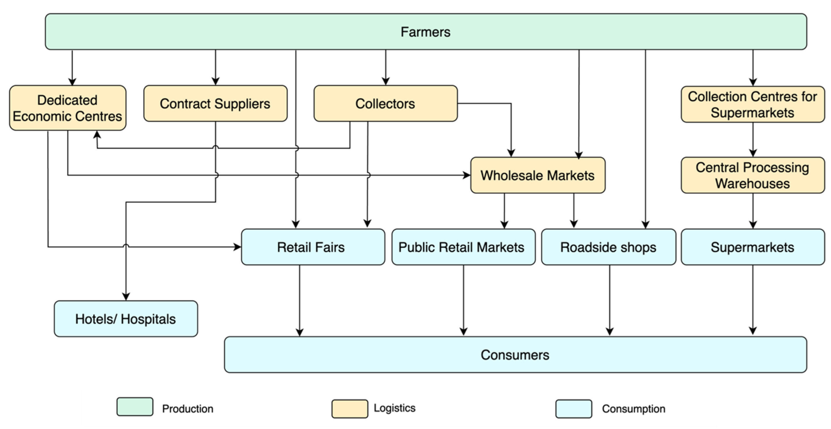 | Collection centre | Small-scale facilities near farming areas where farmers drop off produce, often operated by traders, cooperatives, or supermarket chains. |