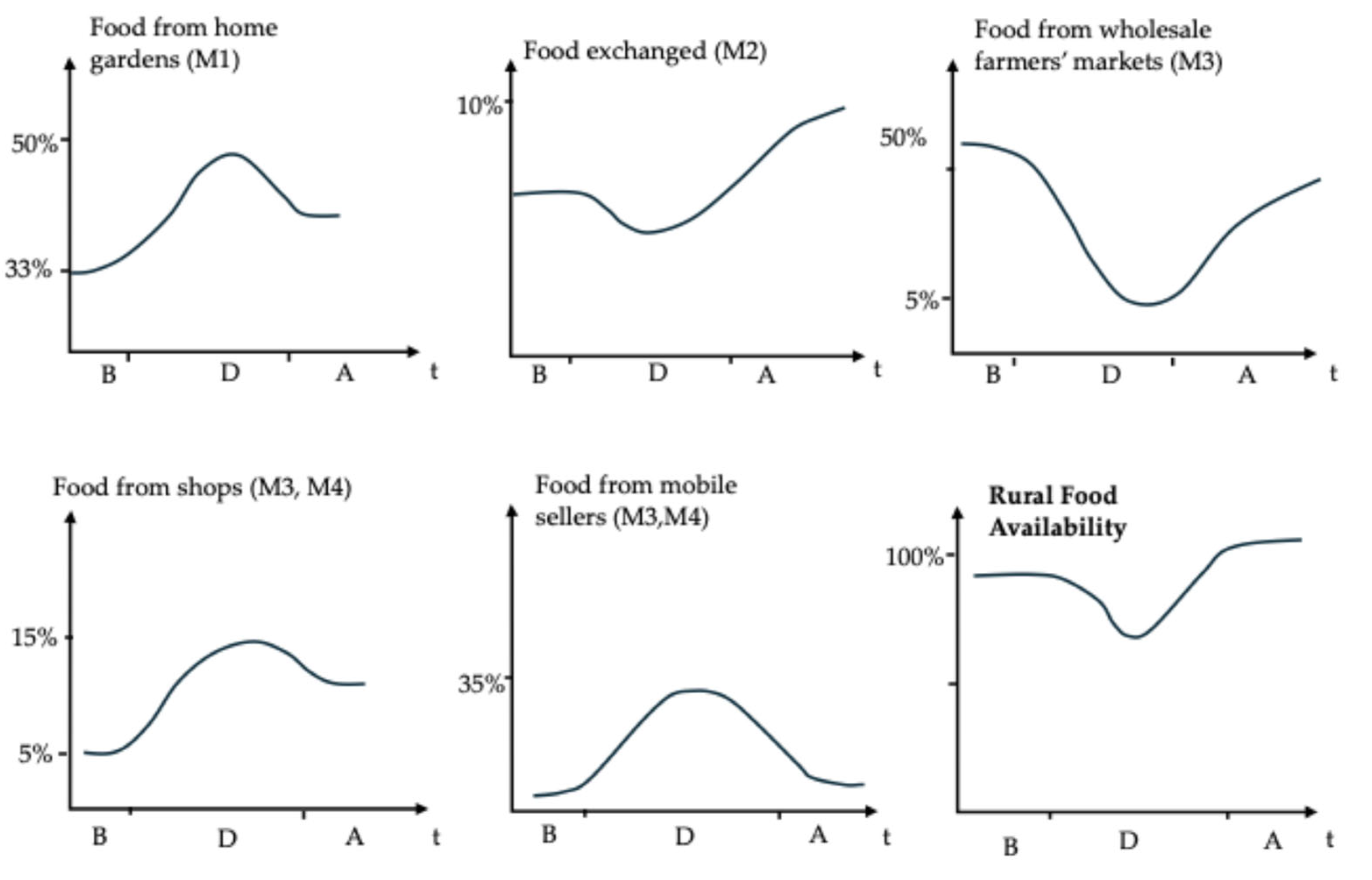 - Semi-urban systems adopted hybrid portfolios—expanding home gardening (M1), strengthening sharing (M2), and combining physical and digital linkages (M3 and M4) supported by proximity to producers.