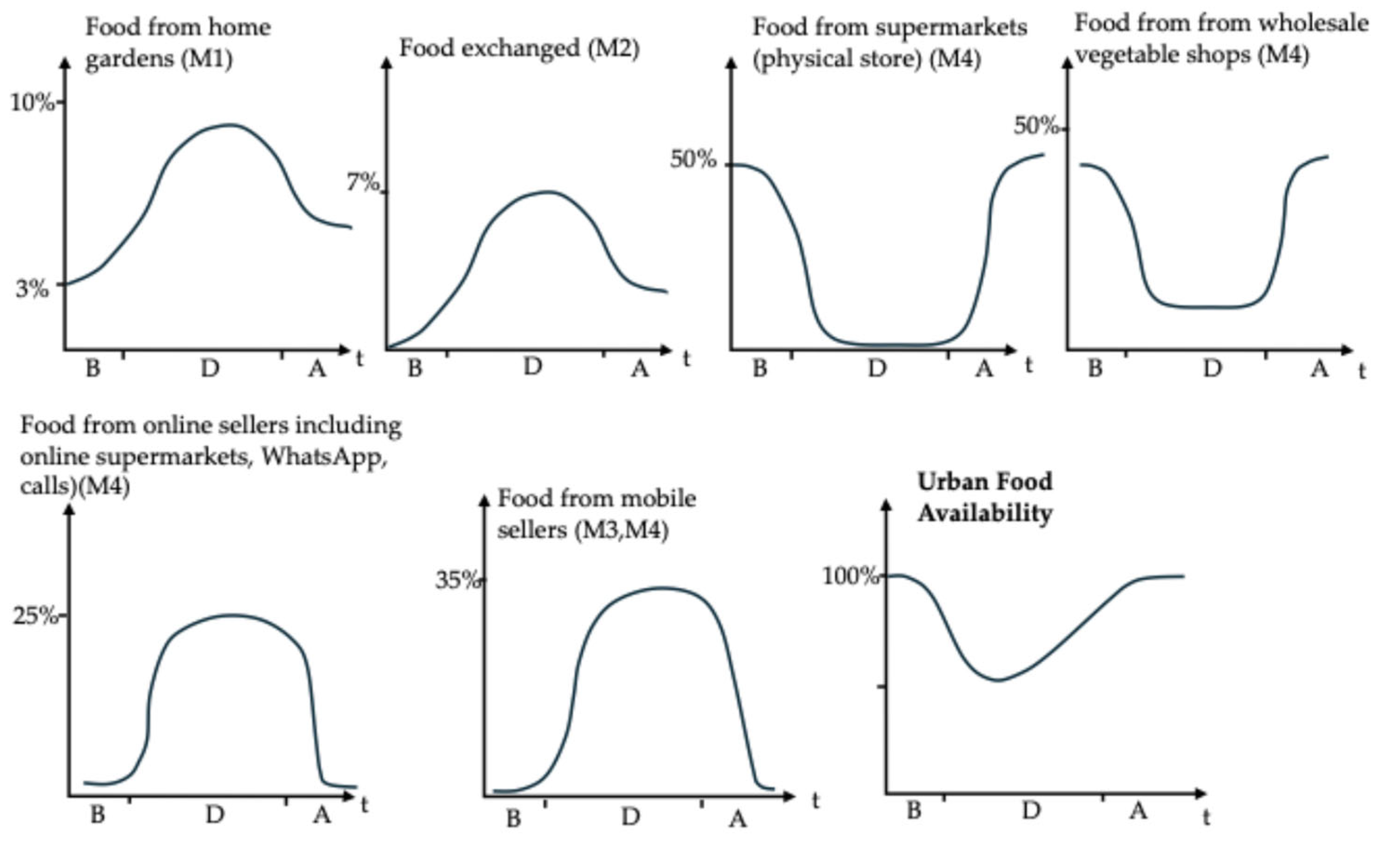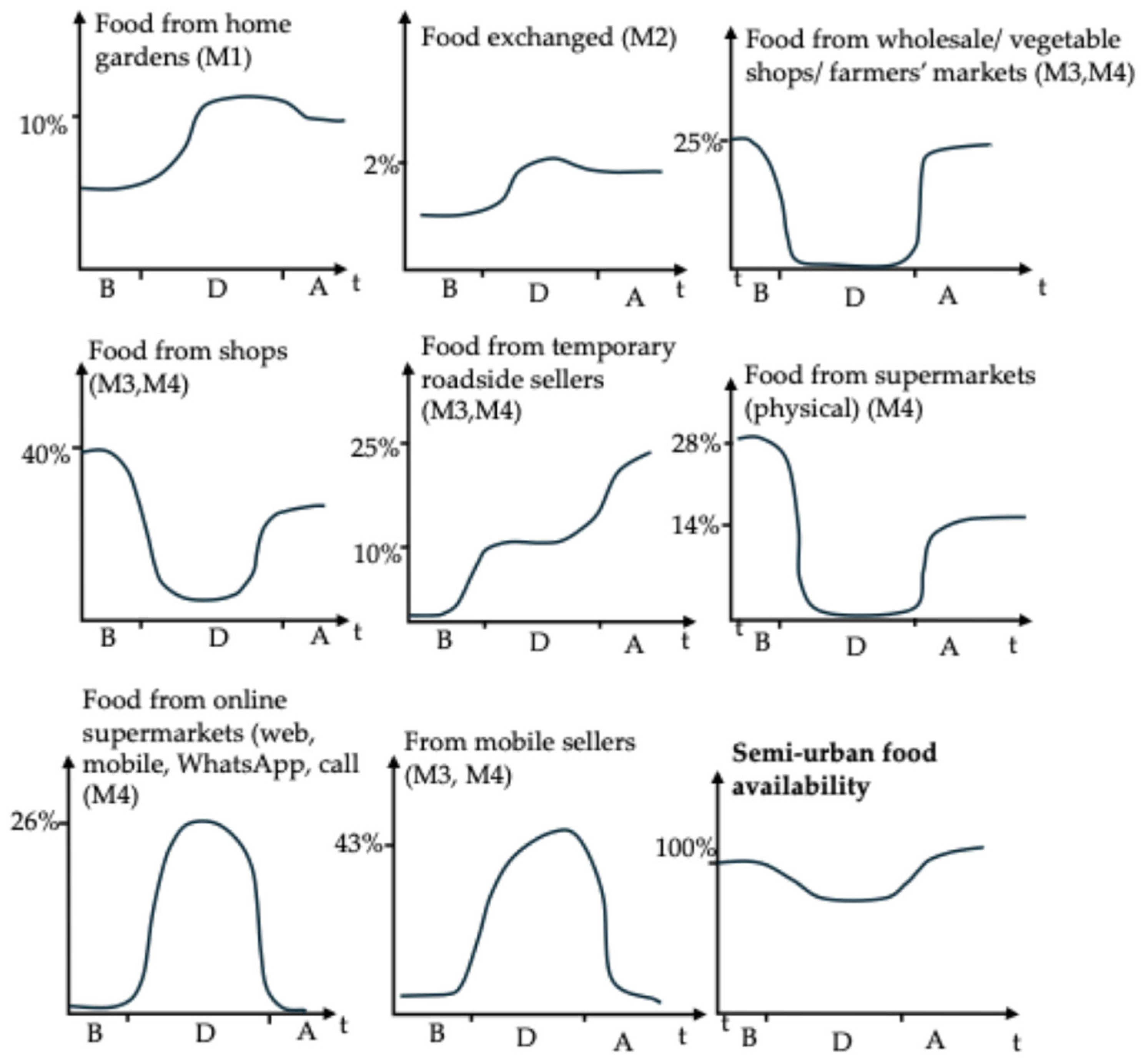 - Urban systems relied heavily on digitalised intermediaries (M4 online) and mobile sellers (M3) yet faced higher food insecurity due to space constraints and dependence on supermarkets.