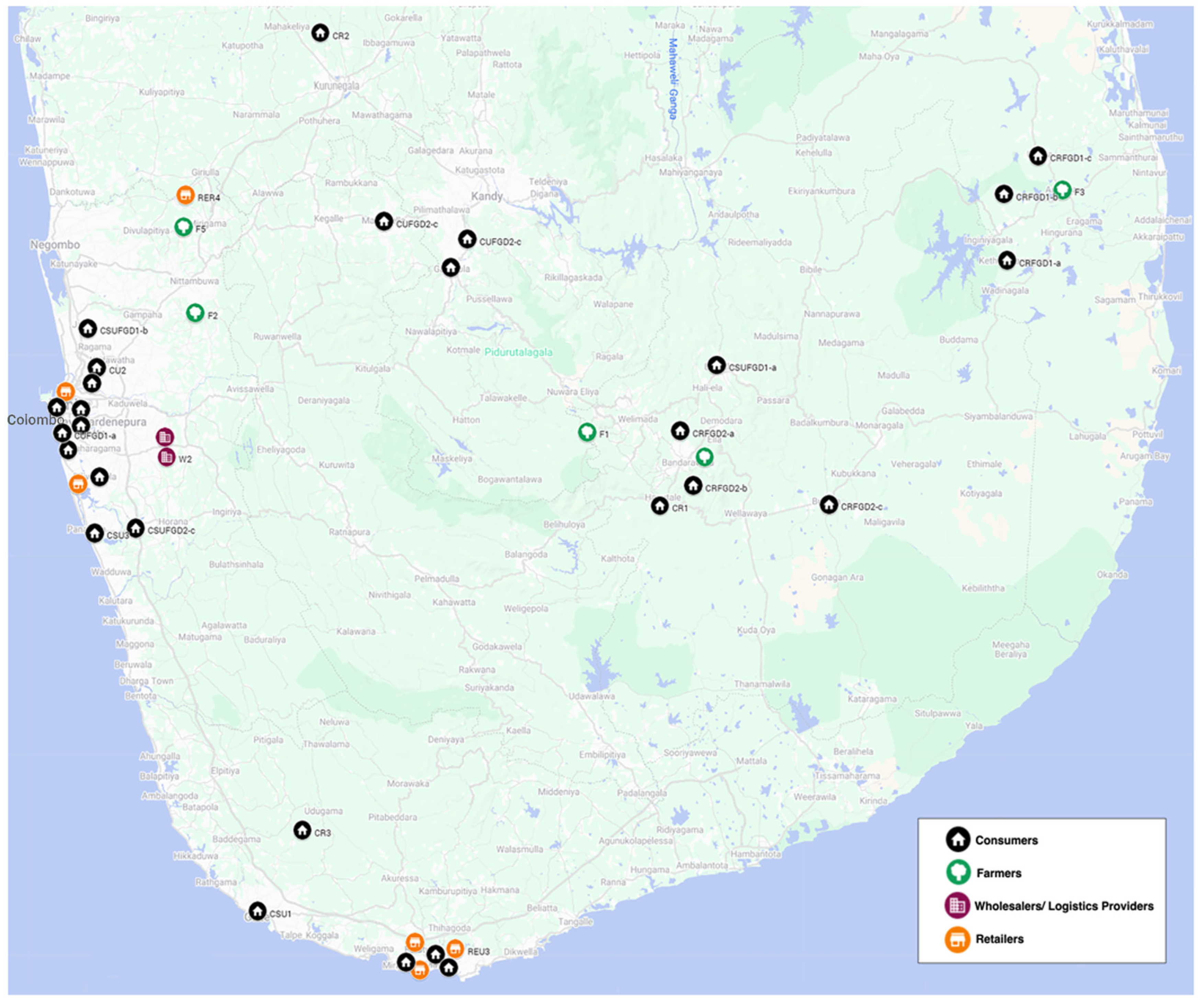 - Fernando, W.M.; Thibbotuwawa, A.; Ratnayake, R.M.C.; Perera, H.N. Digitalizing smallholder farmer agri-food supply chains: A case study from a developing economy. In Proceedings of the International Conference on Advances in Production Management Systems, Cham, Switzerland, 8–11 September 2024; pp. 164–176. [Google Scholar]