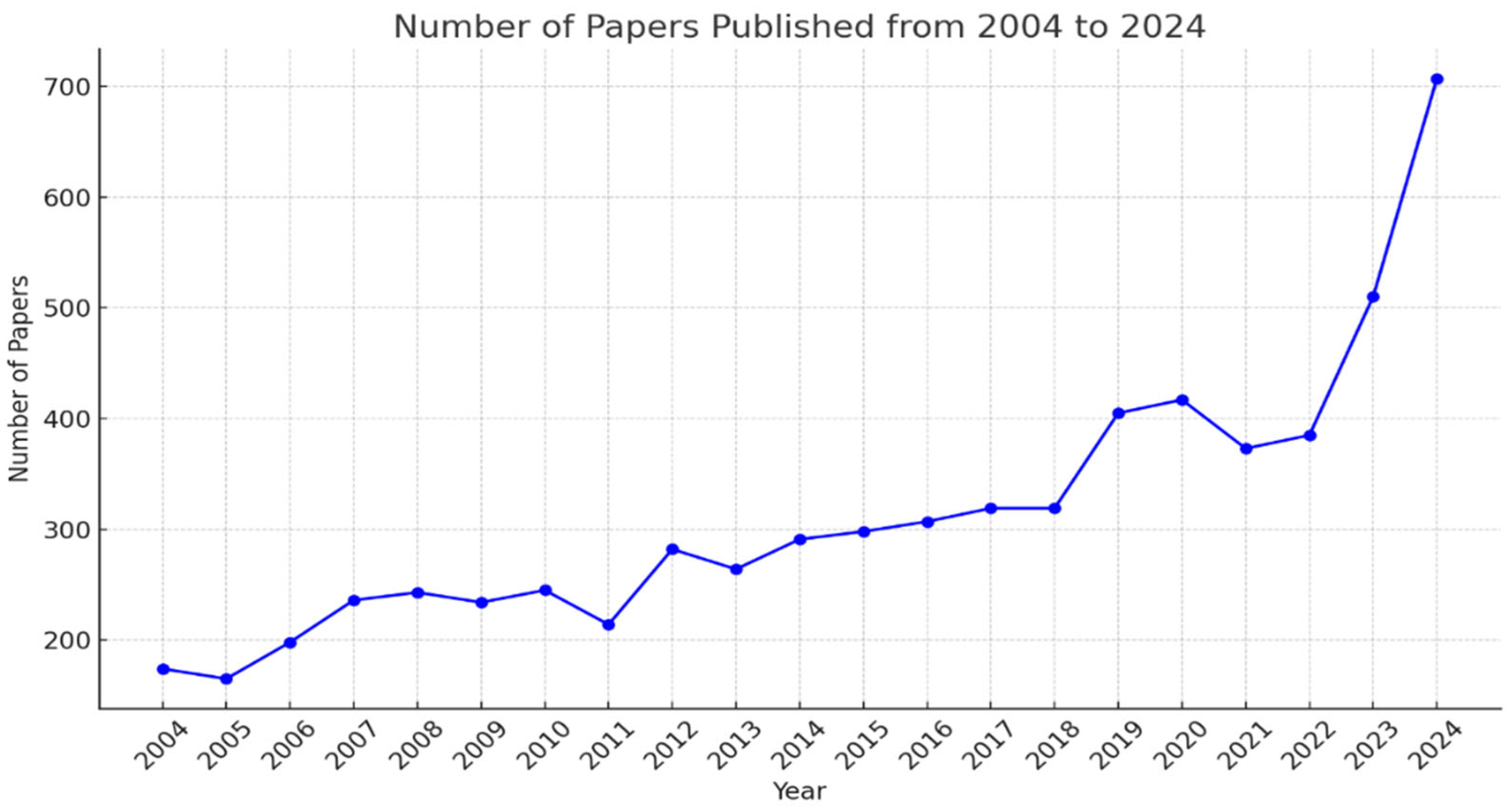 Our analysis of scholarly articles published between 2004 and 2024 reveals substantial growth and transformation in SSCM research. From an initial pool of approximately 10,500 papers retrieved through targeted keyword searches, we refined our dataset to 6586 papers suitable for topic modeling after rigorous data integrity checks and relevance screening. This refined sample forms the foundation for our longitudinal analysis.