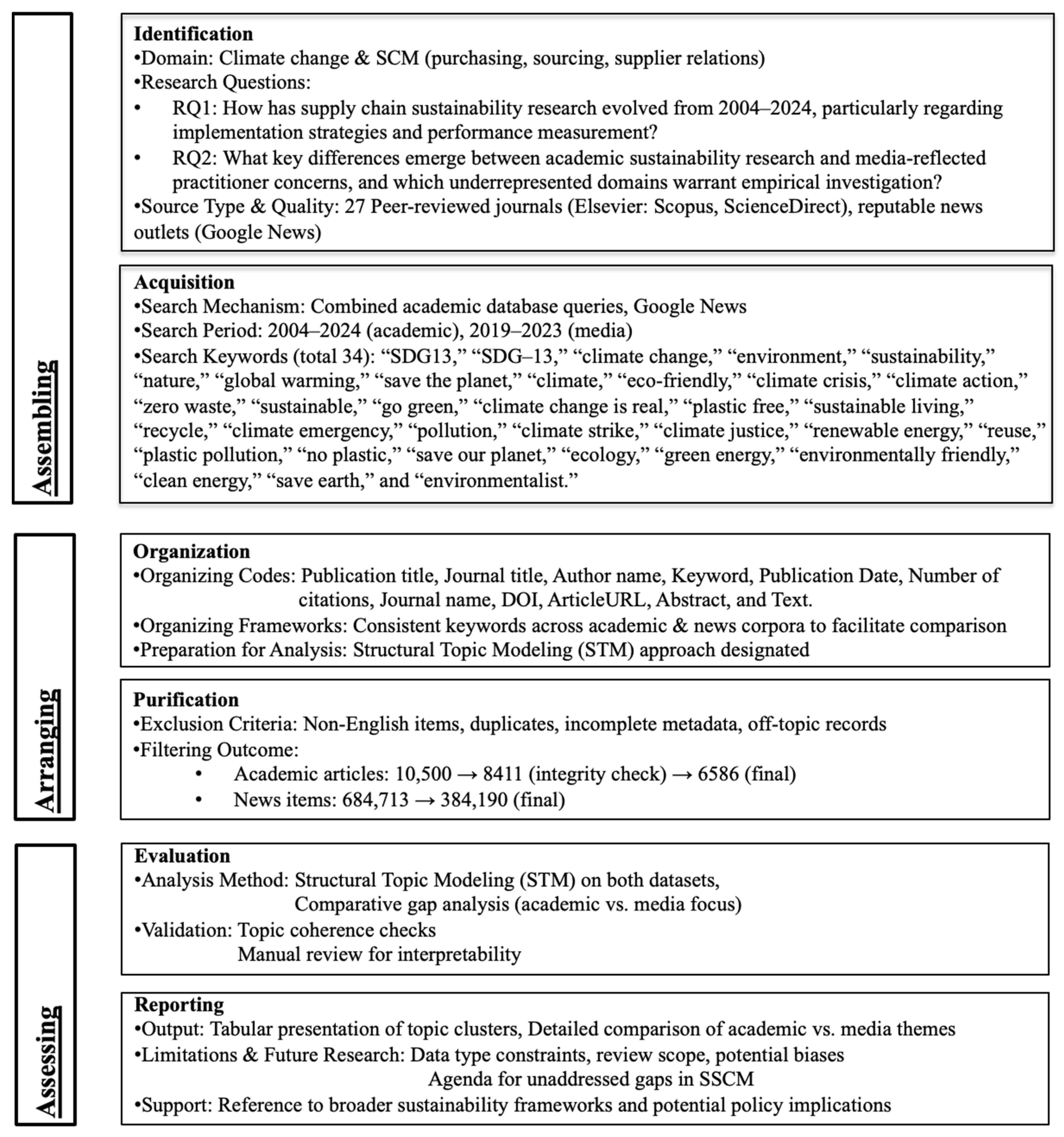 18], yet their reliance on published literature limits the potential to identify evolving implementation challenges documented in practitioner discourse before receiving systematic academic attention. The reliance on established literature proves insufficient for discovering accelerating environmental regulatory change, technological innovation, and evolving stakeholder expectations characterizing contemporary supply chain environments. Addressing these methodological limitations necessitates approaches responsive to real-time sustainability challenges. Media discourse provides systematic documentation of practitioner responses to regulatory changes and sustainability initiatives, revealing implementation challenges before they receive scholarly treatment [