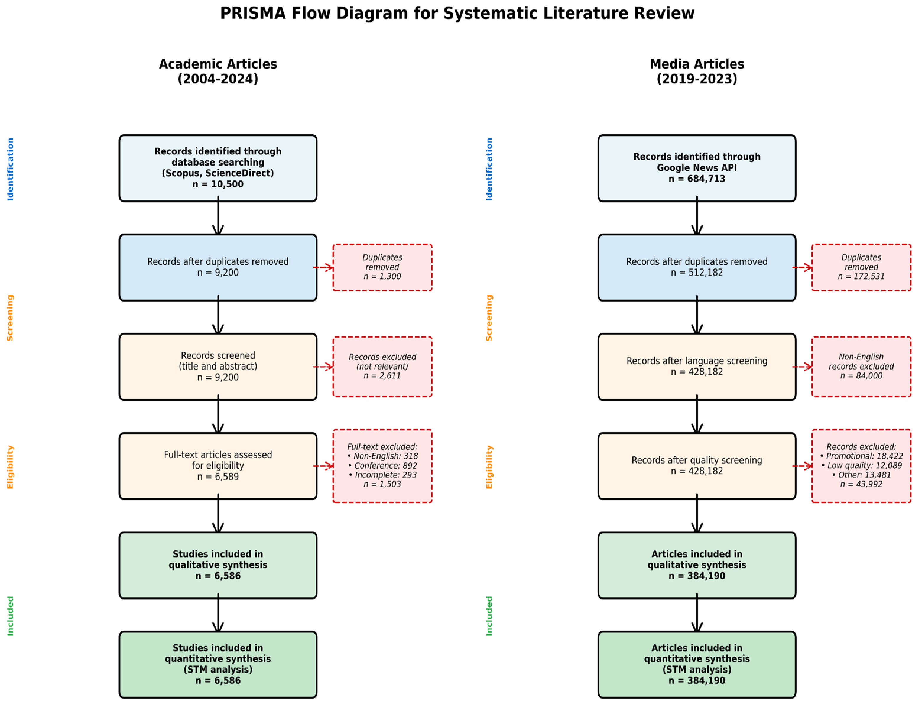 The temporal coverage differences between academic and media datasets—academic articles spanning 2004–2024 versus media articles covering 2019–2023—introduce potential comparability concerns. While this design choice reflects practical considerations regarding media data availability and contemporary relevance, it may influence comparative conclusions. We addressed this concern through matched-window reanalysis (detailed in