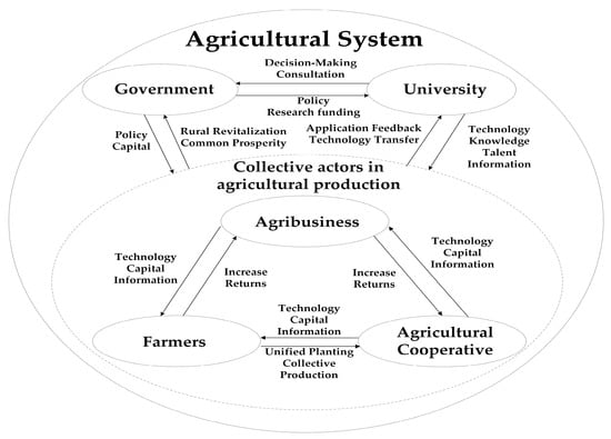 Rural entrepreneurial activities are characterized by collective collaboration among agribusinesses, farmers, and cooperatives [], and exploiting collective entrepreneurial opportunities in rural regions confronts systemic constraints such as weak resistance to risk, low return on investment, natural constraints, and a monolithic industrial structure, which require the intervention of external actors to mitigate structural barriers [].