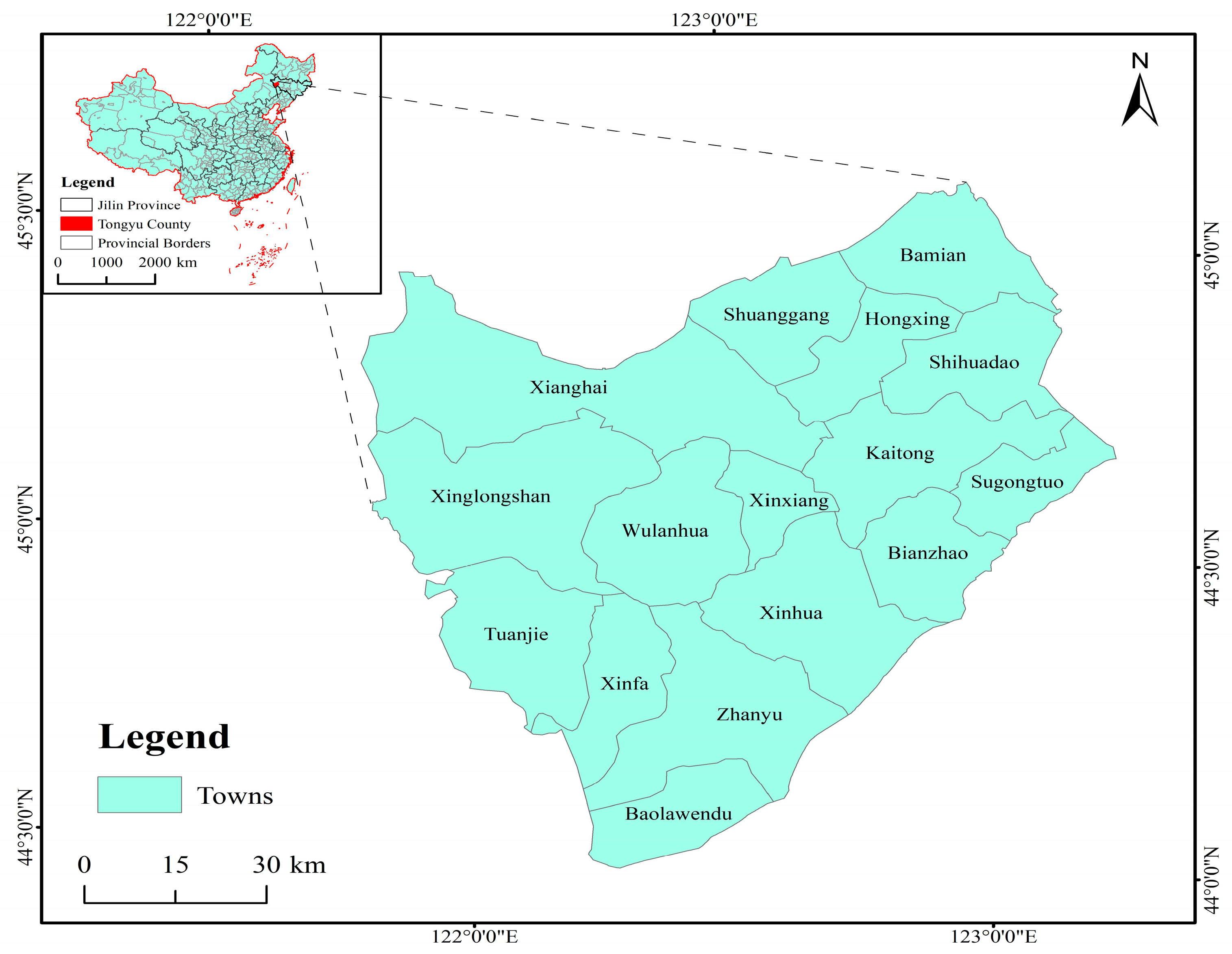 Tongyu County is located in Baicheng City, Jilin Province, on the eastern border of the Horqin Grassland. The county covers an area of 8496 square kilometers; the county comprises 16 administrative townships with a registered population exceeding 360,000 (see Figure 2).