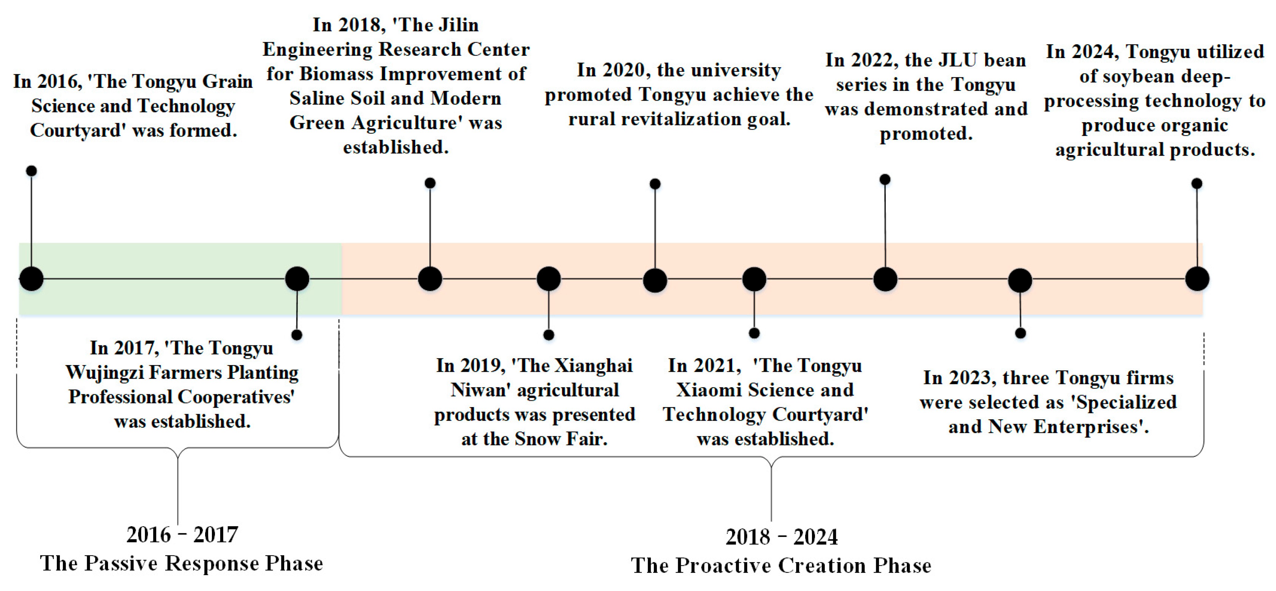 This stage is followed by the proactive creation phase (2018–2024) in Tongyu. In this phase, the behavioral dynamics of the rural collectives shifted from external force to internally spontaneous actions. They actively pursued transformation, took the initiative to seek saline land restoration and deep processing technical support, and cooperated with Jilin University to create an engineering research center and jointly invest in the development of saline land and saline-tolerant soybeans to create a brand of agricultural products.