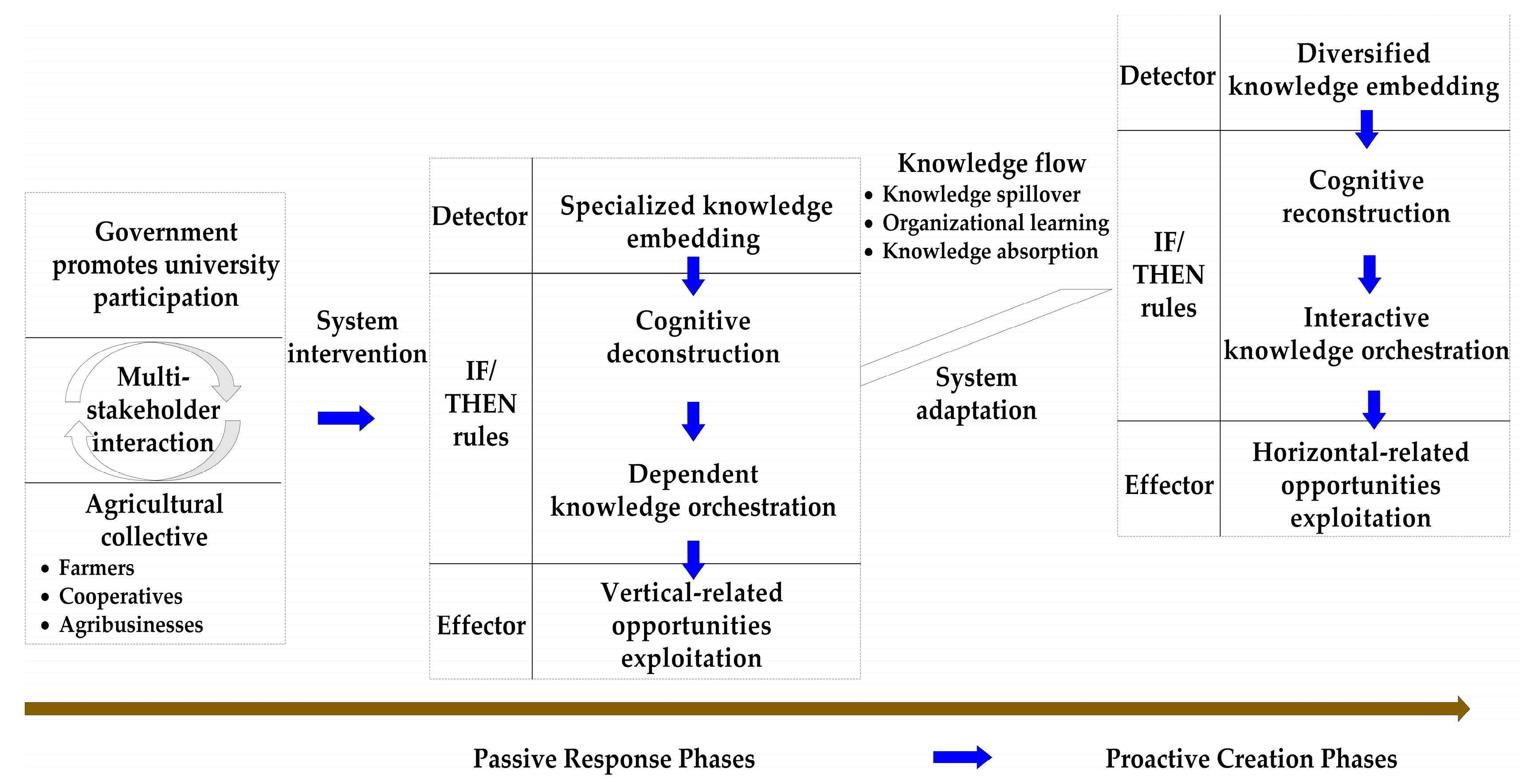 Extending this logic to rural collective entrepreneurship, we establish an integrative framework to clarify how knowledge is both a strategic asset and a catalytic driver in systemic adaptive evolution processes. Specifically, the government’s bottom-up policy promotion for university participation functions as a detector that categorizes and interprets knowledge signals. This cognitive schema transformation reshapes rural actors’ perceptions of academic knowledge through dynamic evolution, which systematically guides their knowledge orchestration rules. The resultant behavioral (effectors) manifest as related opportunity exploitation, generating feedback loops wherein (1) top-down implementation: government-driven universities participate in disseminating scientific knowledge and shaping rural actors’ adaptation cognition, knowledge orchestration strategies, and related opportunity exploitation; and (2) bottom-up feedback: rural collectives’ bottom-up knowledge flow enables dynamic assessment of knowledge orchestration efficacy through detector adaptation. This integrated perspective reveals the complex linkages between cognition scheme, knowledge orchestration, and entrepreneurial opportunities within both bottom-up and top-down multilevel adaptation networks involving government, universities, and agriculture stakeholders, ultimately reflecting the CAS principle of adaptation and complexity.