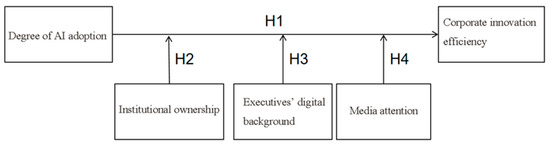 Moreover, institutional investors not only improve governance structures but also facilitate the formation of an AI-related innovation ecosystem through capital allocation. They exert a significant positive effect on enterprise innovation, particularly by strengthening the relationship between innovation input (e.g., R&D expenditure) and output (e.g., patent quality) [24]. In firms with high institutional ownership, AI adoption enhances innovation performance, sustainable innovation capability, and market competitiveness. Based on this analysis, this study proposes the following hypothesis:
