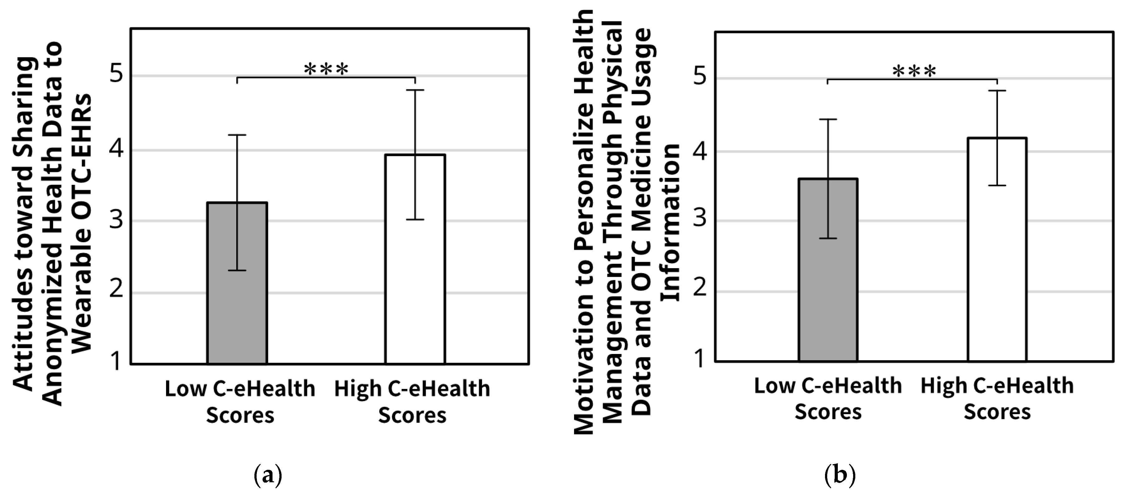 3.3.3. eHealth Literacy and Motivation to Personalize Health Management Through Physiological Data and OTC Medicine Usage Information with Wearable-Device-Based OTC-EHRs