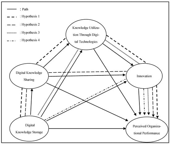 Digital Knowledge Storage positively influences Digital Knowledge-Sharing, which positively influences Knowledge Utilization Through Digital Technologies, leading to innovation, which ultimately enhances Perceived Organizational Performance.