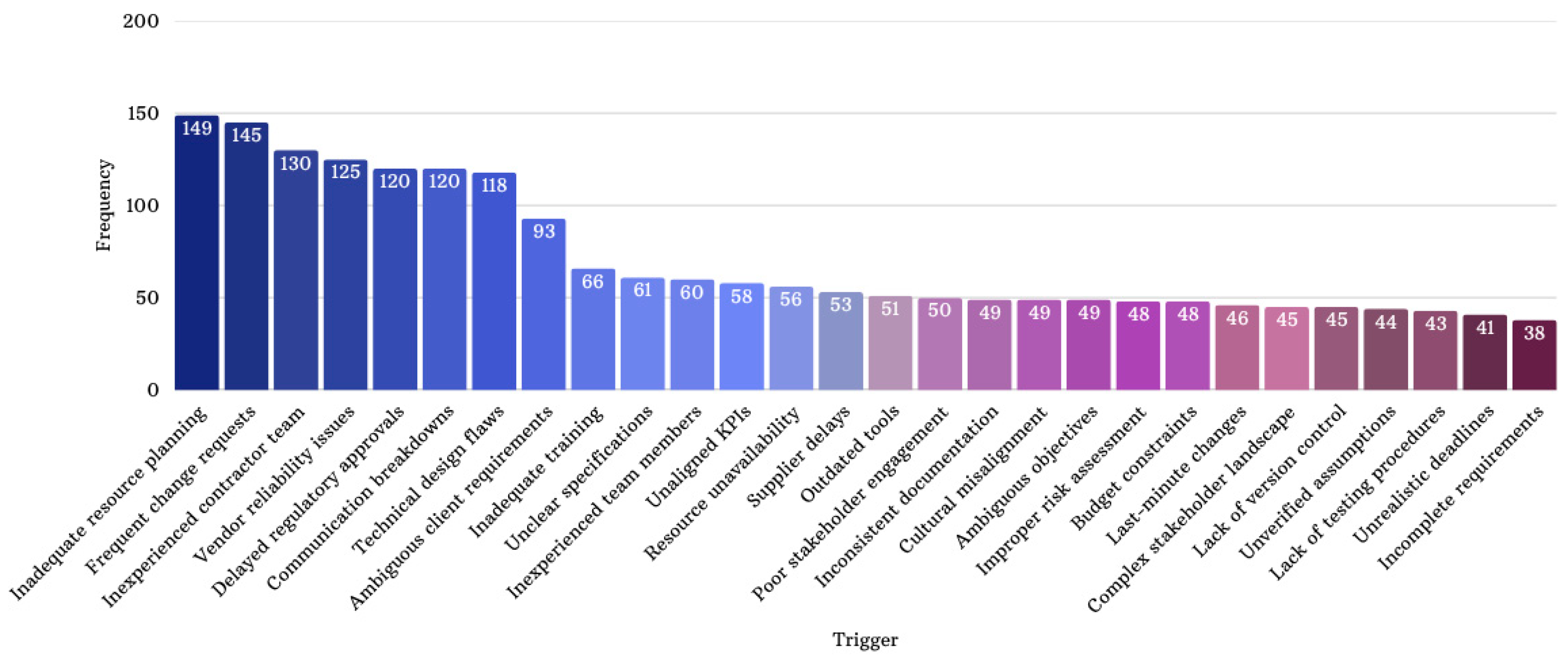 | Trigger | Specific cause of the risk, classified into 28 categories such as “Budget constraints,” “Inadequate resource planning,” or “Vendor reliability issues.” | Categorical | “Budget constraints.” |