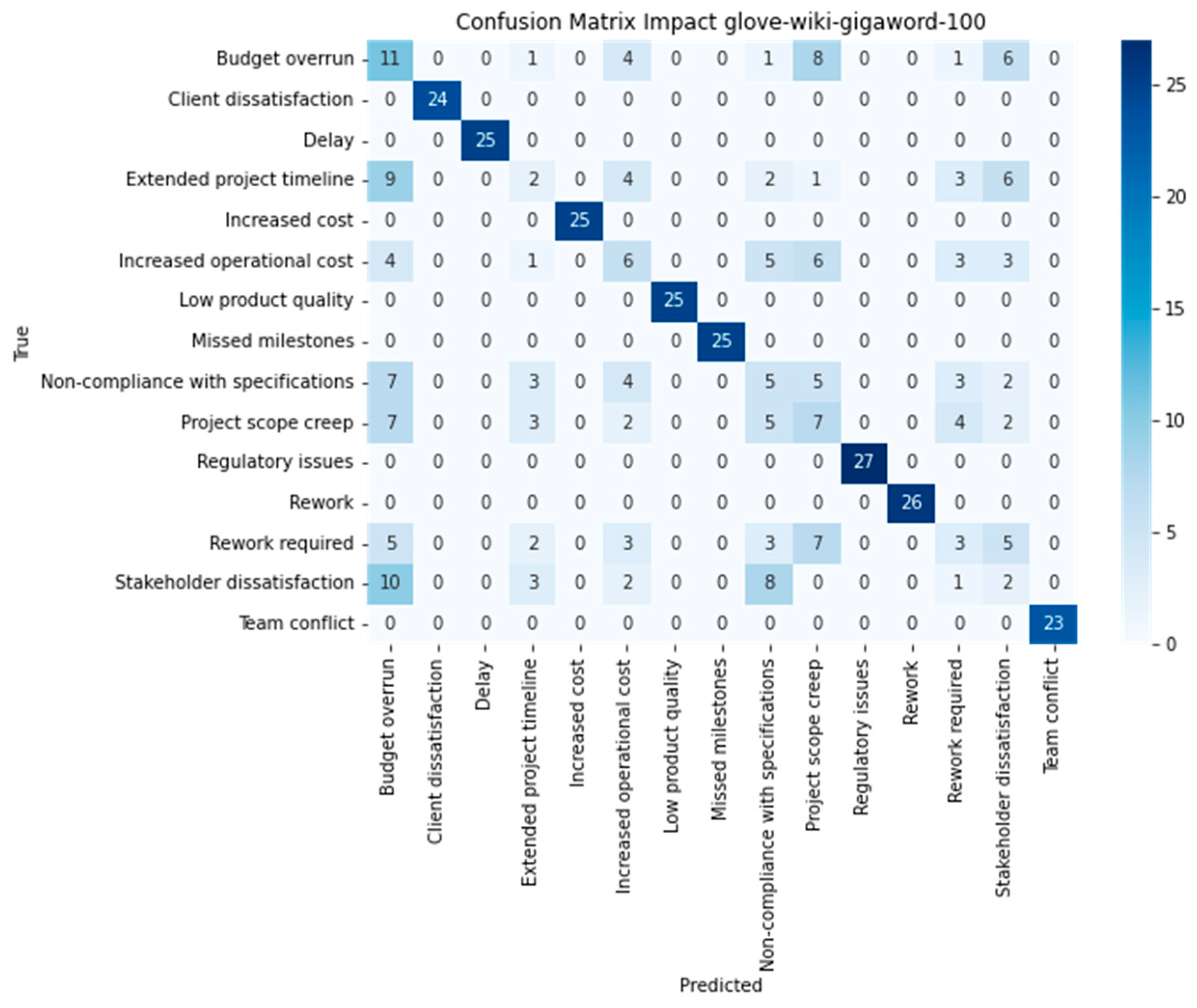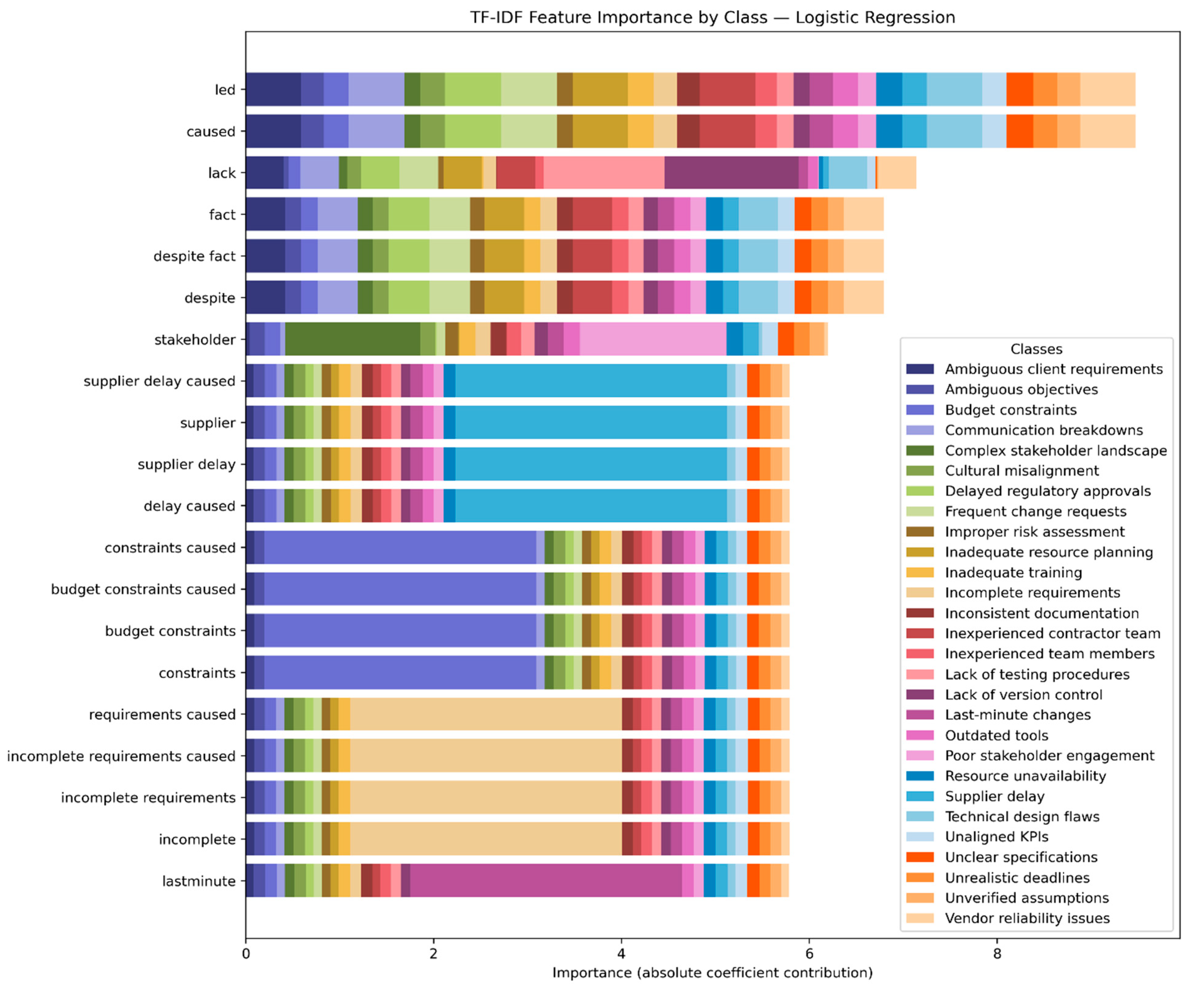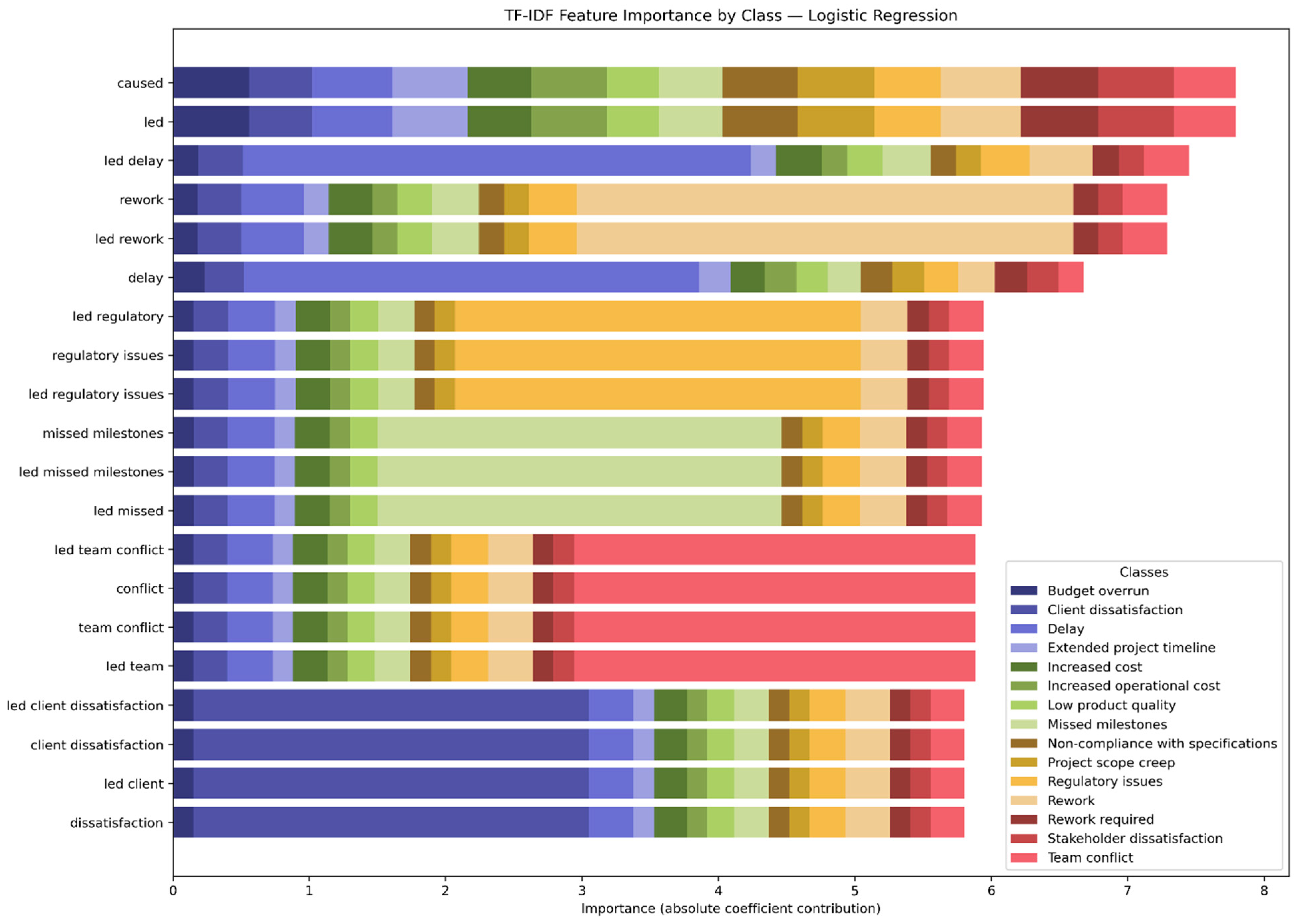 - For Scope, the main n-grams used by the model to make a decision are “scope project”, with a magnitude greater than 1, followed by “delay”, “oversight led delay”, and “led missed”, with magnitudes lower than 0.2.